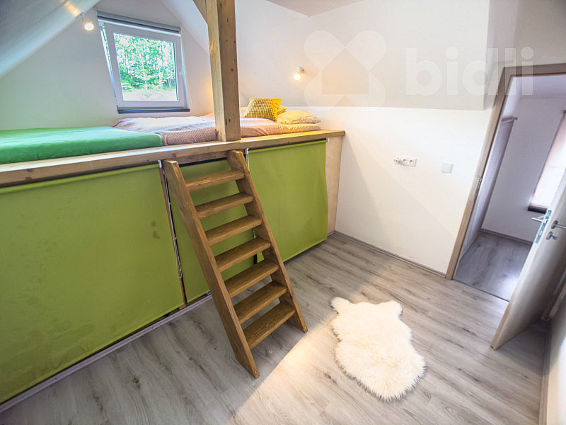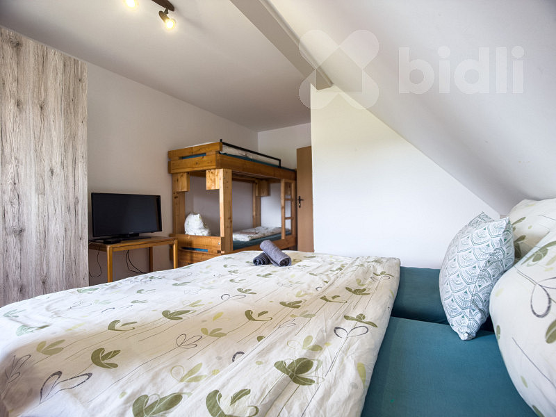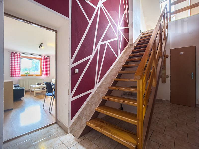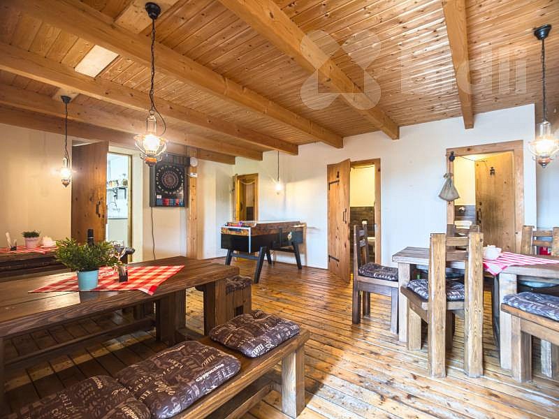 Ubytovací část s kapacitou pro 15 hostů: v přízemí je společenská místnost s krbovými kamny, kuchyně s jídelním stolem, v horním patře jsou další 4 samostatné pokoje, WC a velká koupelna se 2 sprchovými kouty a umyvadly. Součástí je také garáž, úschovna jízdních kol i lyží.