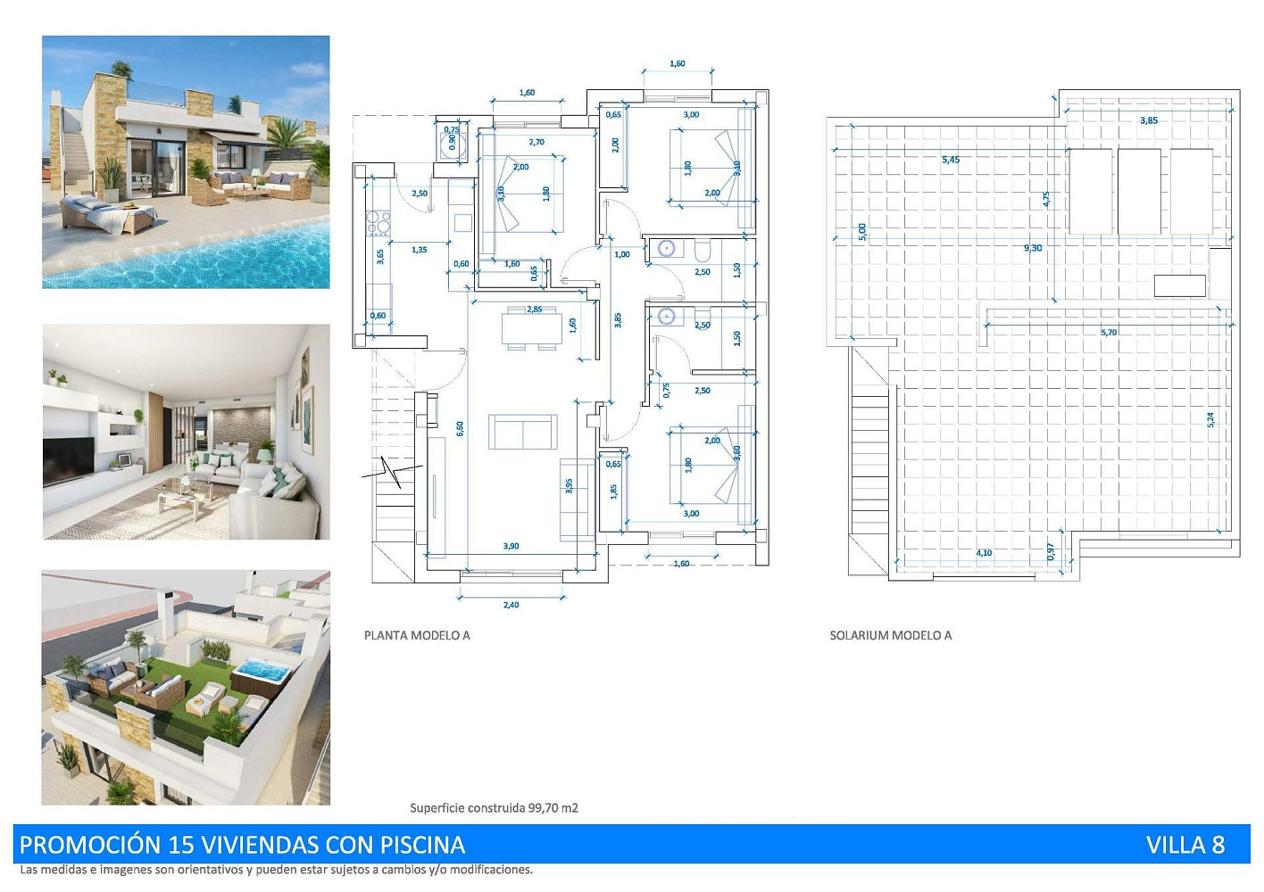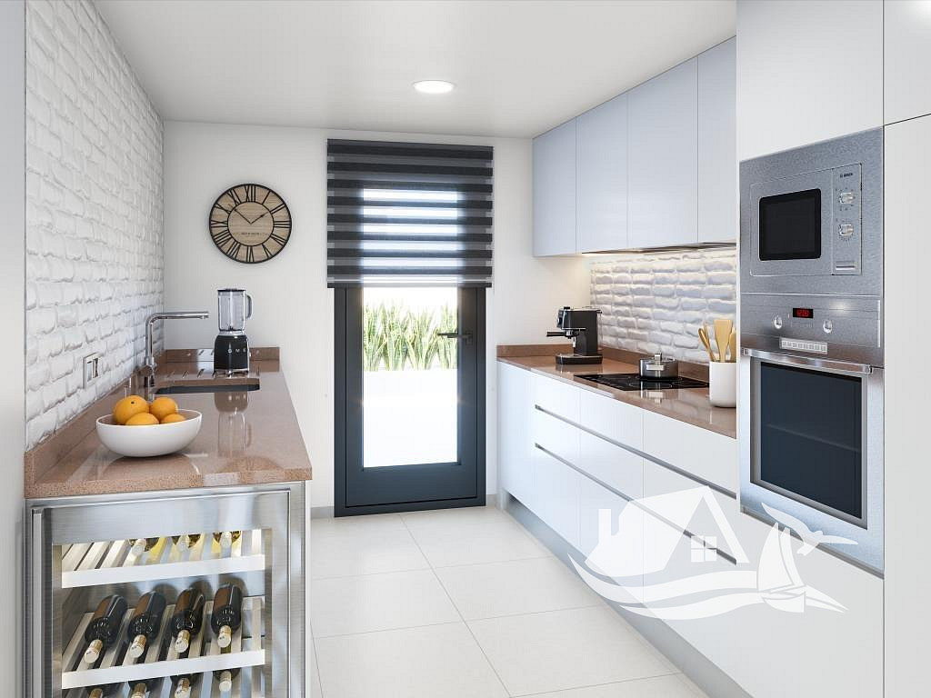 Každá vila je navržena v praktickém jednopodlažním stylu a nabízí světlý, otevřený prostor s důrazem na funkčnost a příjemné propojení interiéru s exteriérem. Dispozice zahrnuje tři ložnice s vestavěnými skříněmi, dvě plně vybavené koupelny se sprchovými kouty a moderní otevřenou kuchyni s ostrůvkem, digestoří a systémem úpravy vody. Obývací pokoj s jídelnou plynule navazuje na zahradu s terasou, kde dominuje soukromý bazén a prostor pro slunění. Každá vila má rovněž soukromé parkovací místo a prostorné střešní solárium s výhledem na okolí.
