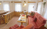 o obývací pokoj nadstandardně velký 32 m² s kachlovou pecí, ideální pro společná posezení,