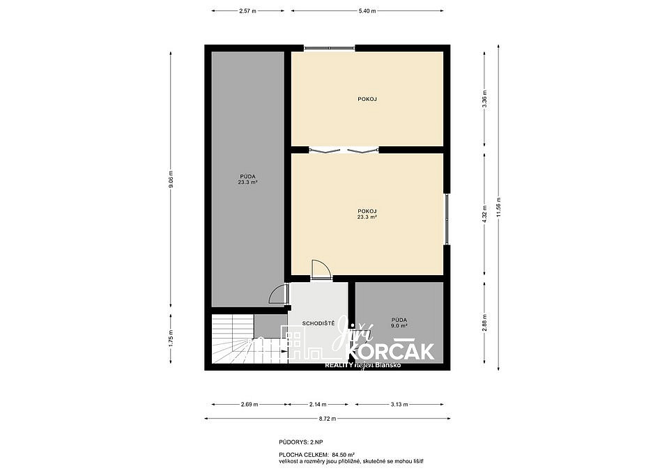 Budova je zděná, částečně podsklepená a nabízí obývací pokoj s ložnicí a kuchyní v přízemí a dva prostorné pokoje se dvěma půdami v podkroví.