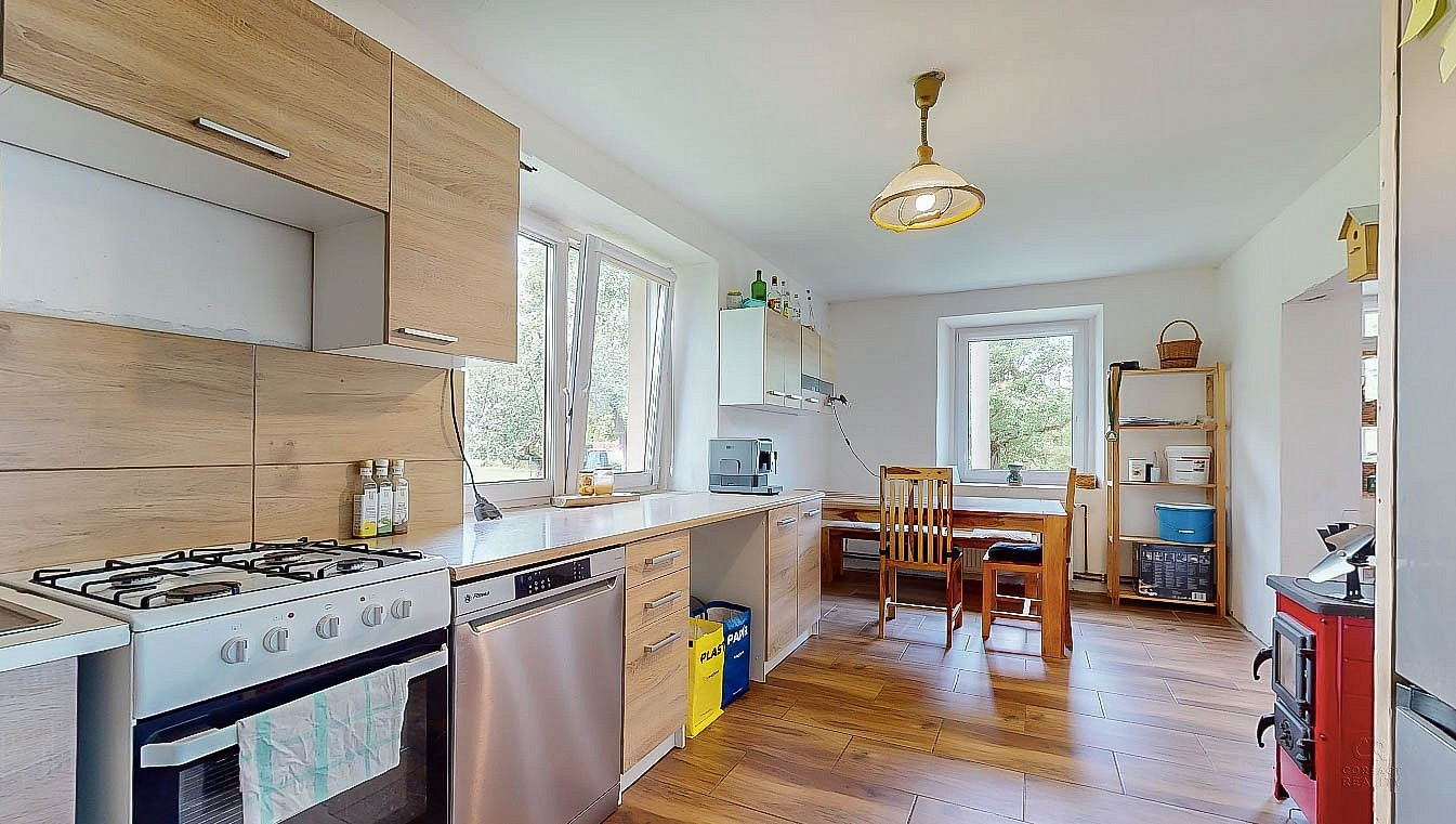 Dům je uzpůsoben pro bydlení tak, že v přízemí majitel vybudoval dispozici 2+1 se samostatnou toaletou, koupelnou a velkou chodbou. V patře jsou další dva pokoje, které je potřeba upravit dle vlastních představ a do těchto pokojů v patře se zatím vchází ze strany velké stodoly, která tvoří druhou část domu. Z chodby v přízemí se dá probourat stěna a za ní jsou již schody do zmíněných dvou pokojů v patře.