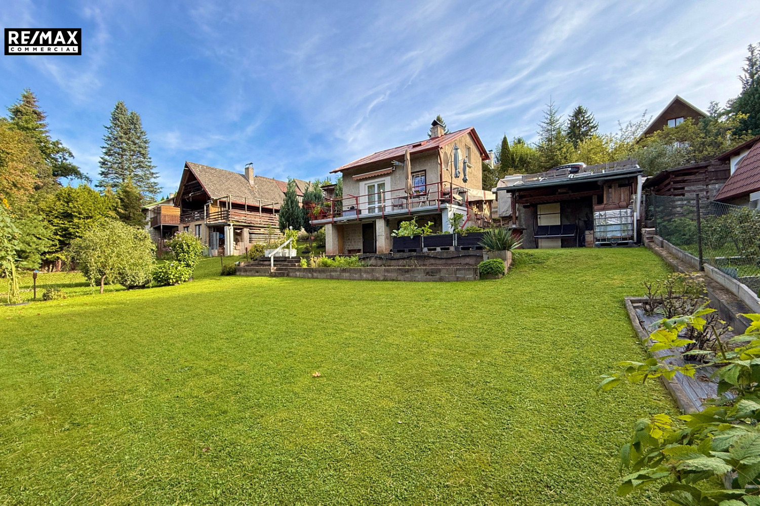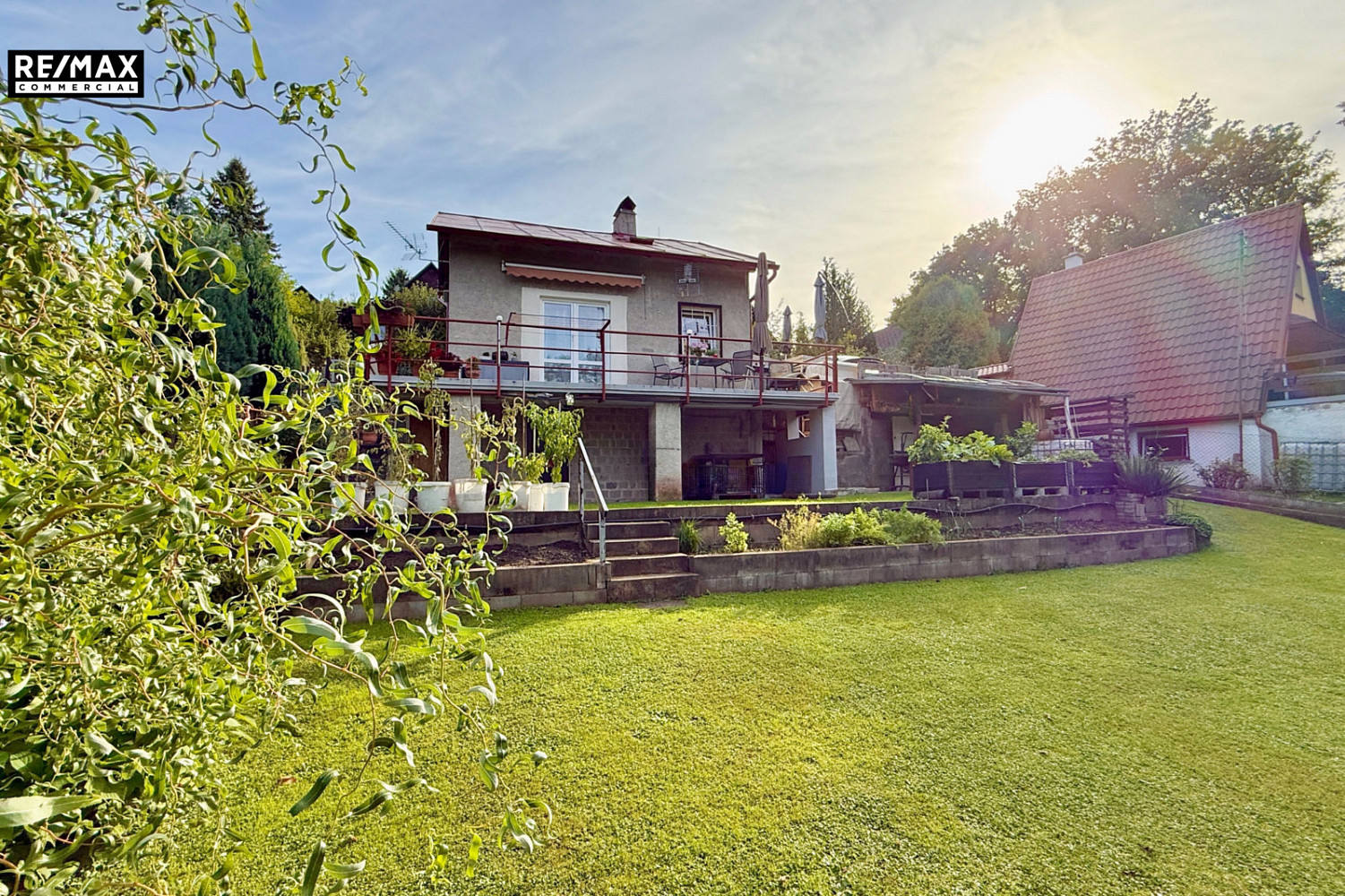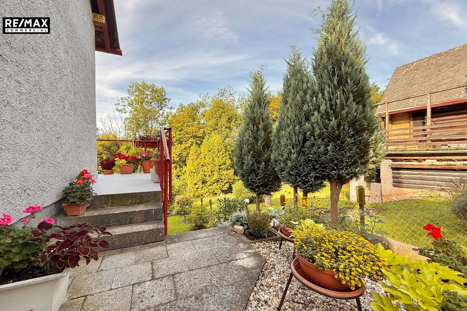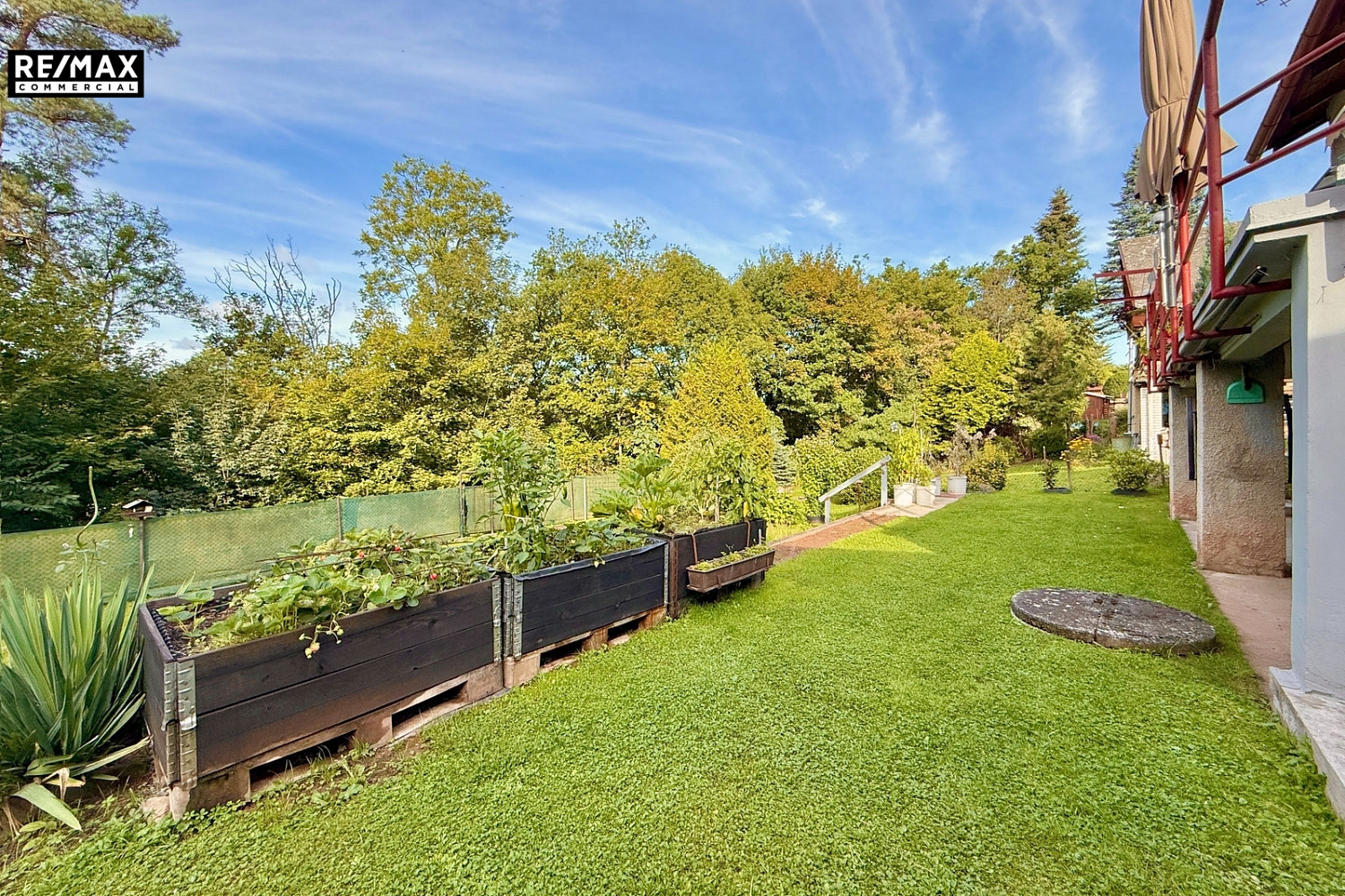 Pozemek je svažitý směrem od chaty a pomocí stěn členěný do tří výškových úrovní. Zahrada je pečlivě udržovaná a kompletně oplocená.