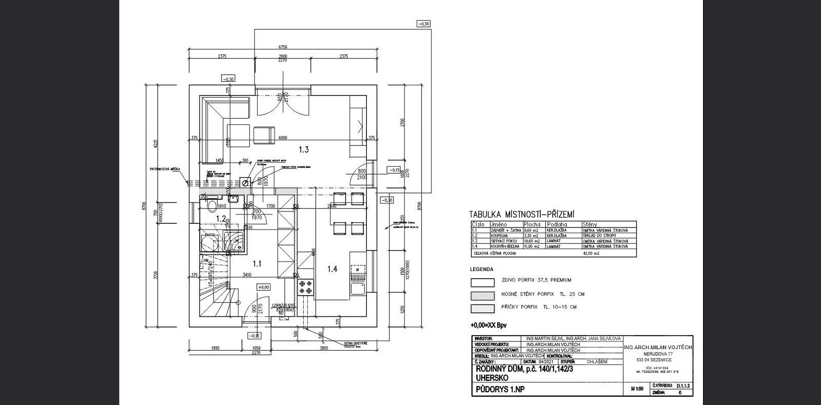 - Přízemí: vstupní hala se schodištěm, obývací pokoj, jídelna, kuchyně, koupelna se sprchovým koutem a WC.