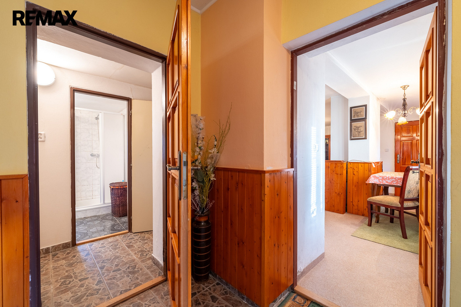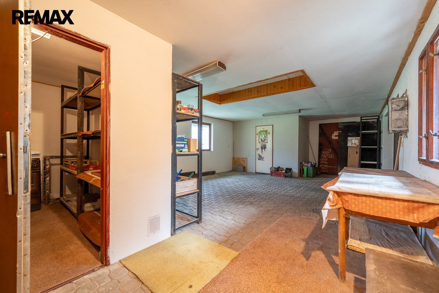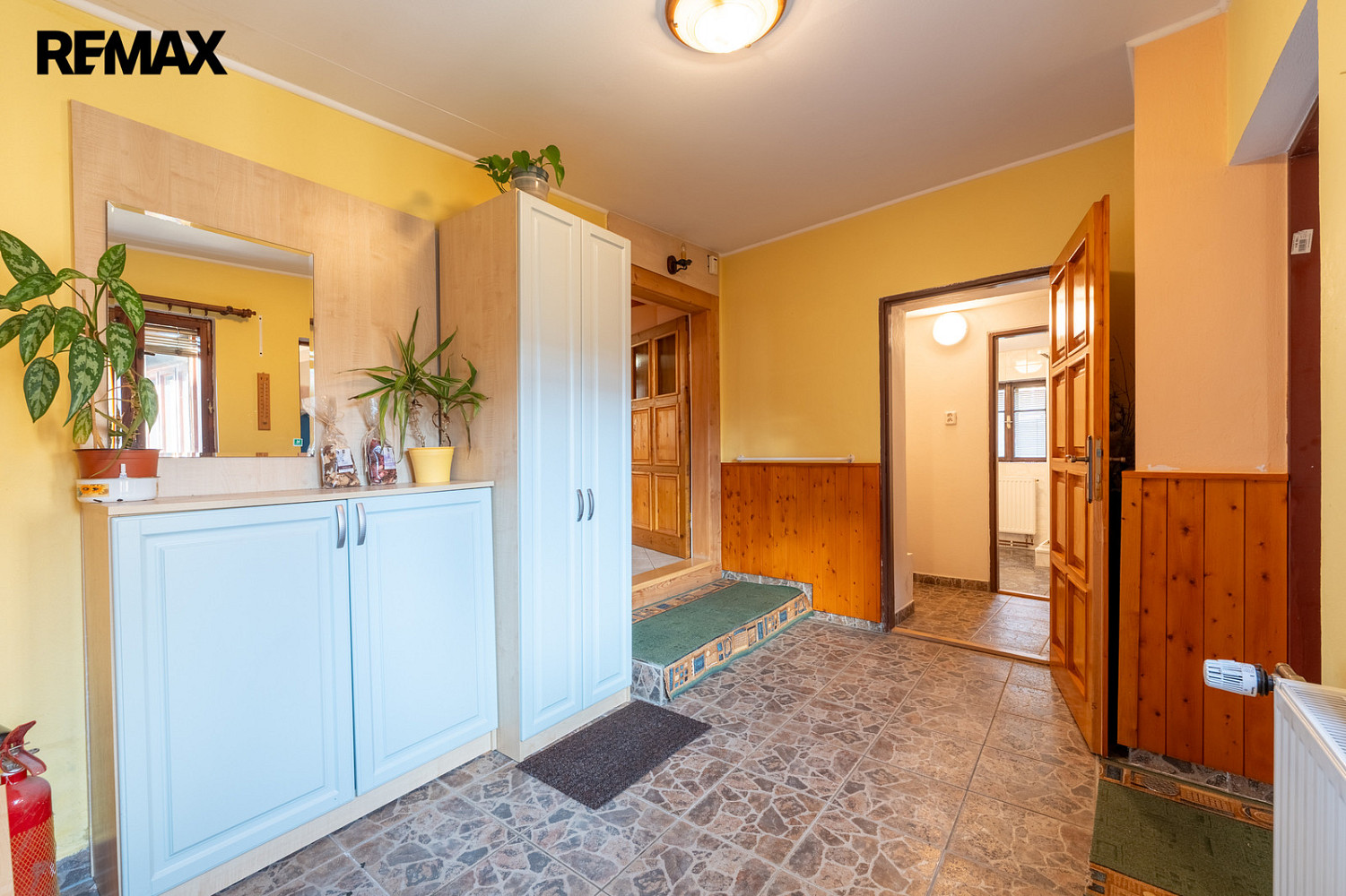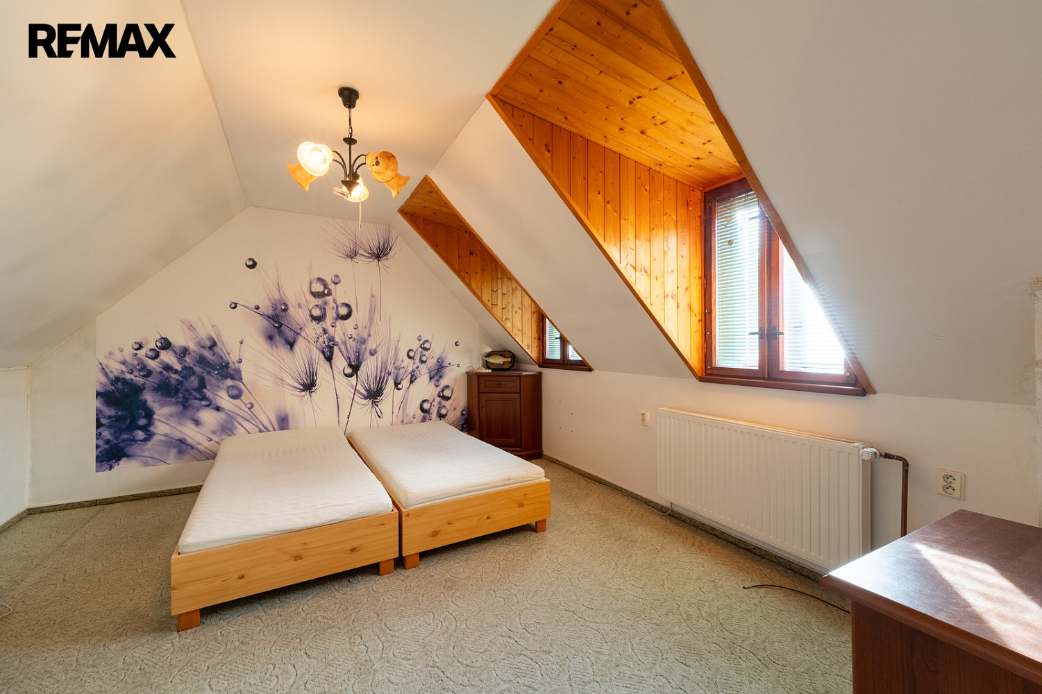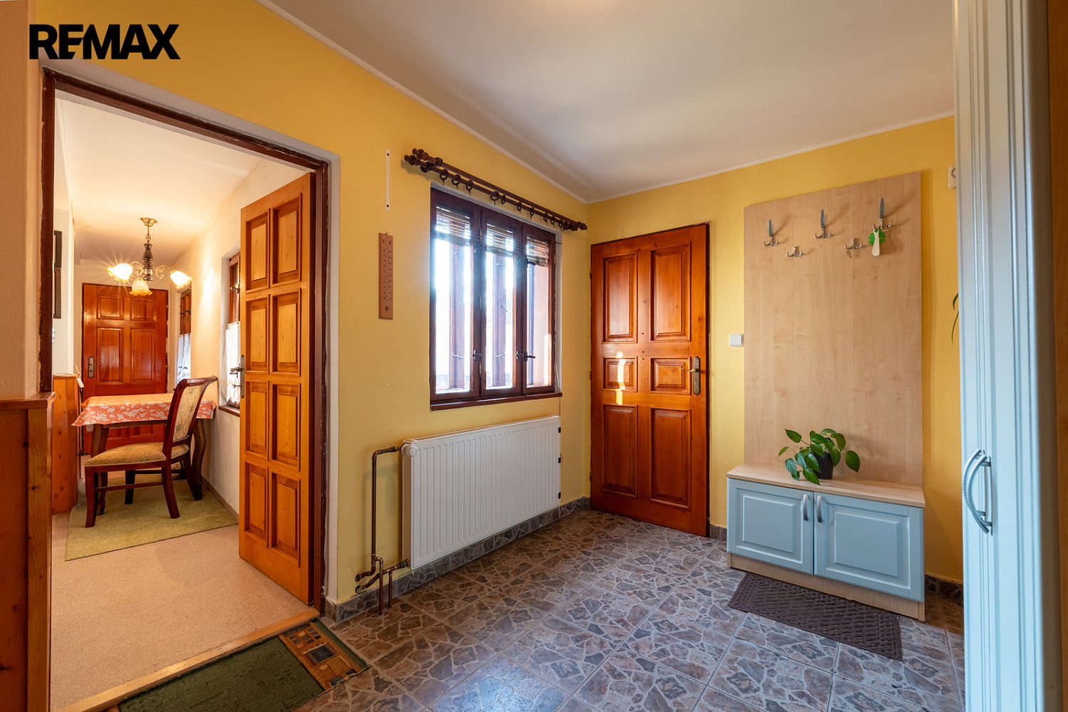 Po vstupu do domu vás přivítá prostorná chodba s úložnými prostory, ze které je možné vstoupit do velkého průchozího pokoje vedoucího dále do garáže. Z chodby je rovněž přístupná koupelna se sprchovým koutem a toaletou a také schodiště do druhého podlaží. V patře se nachází hlavní ložnice a volný půdní prostor, který nabízí možnost dostavby jednoho velkého či dvou menších pokojů podle potřeb nové rodiny. Z chodby v přízemí lze vstoupit také do hlavní obytné části domu, tvořené obývacím pokojem, kuchyní s jídelnou a samostatnou toaletou.