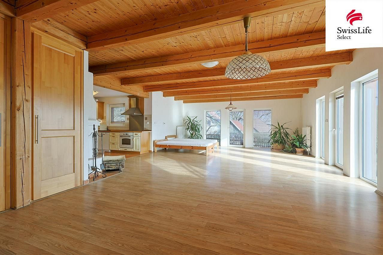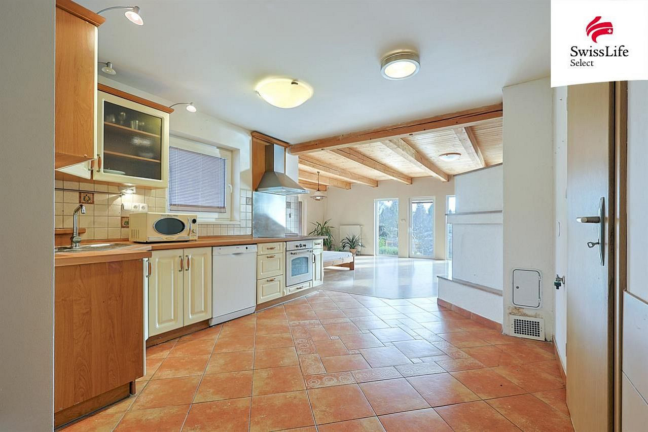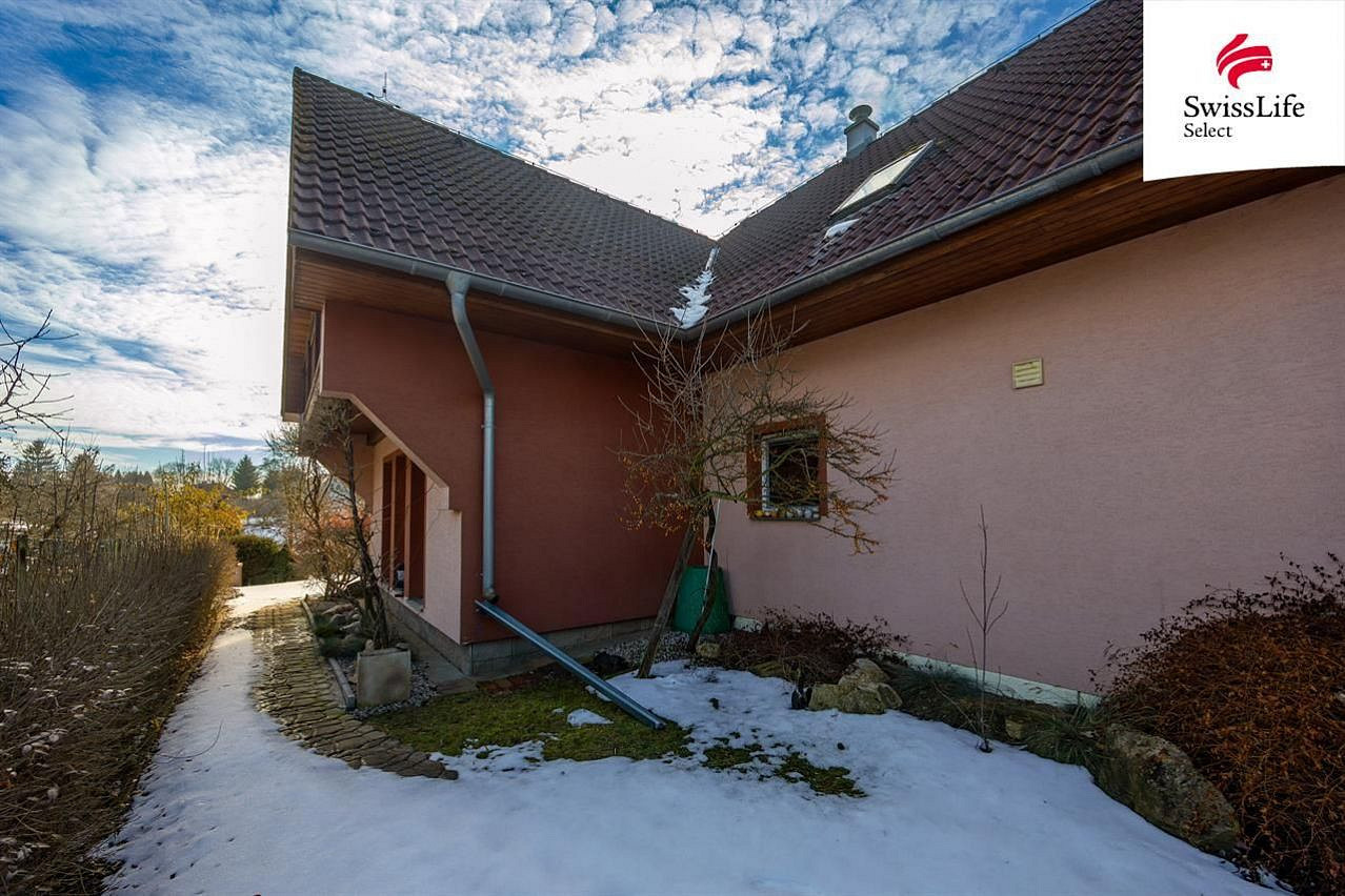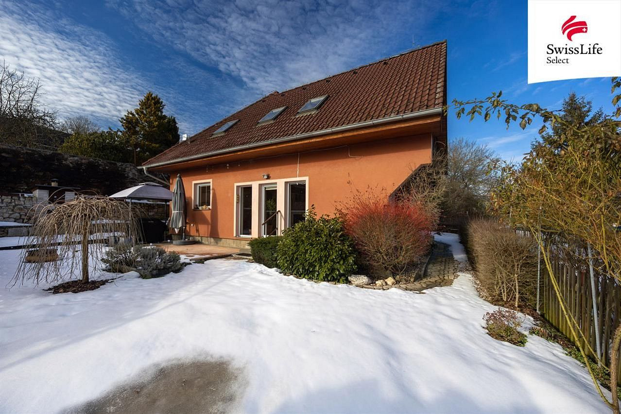 Dům postavený v r. 2008 má krom pěti místností ještě samostatnou šatnu, dvě koupelny a dvě toalety. V přízemí najdete rozlehlý obývací pokoj - 45 m², prosvětlený francouzskými okny na jih a východ s vstupem do zahrady, dále kuchyň, další pokoj, WC, spíž a koupelnu s vanou.