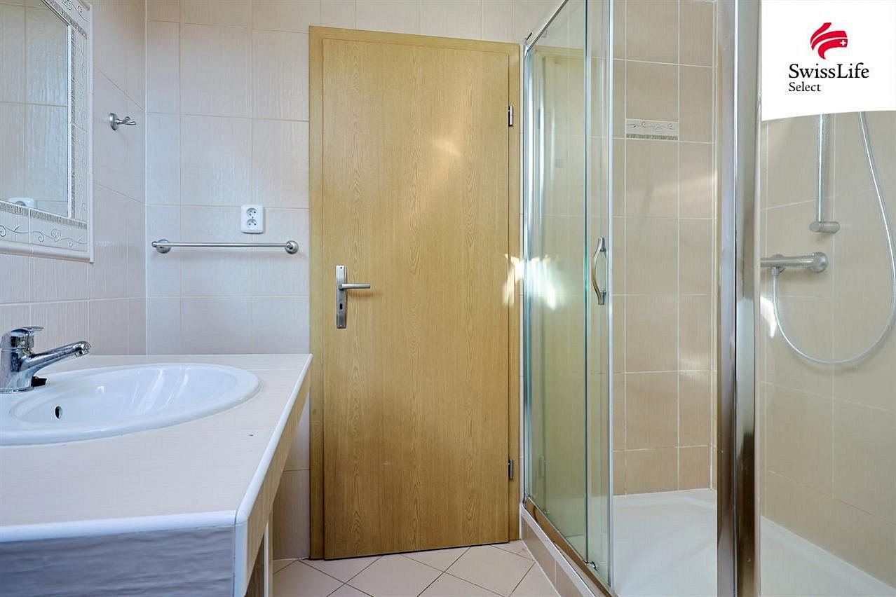 V podkroví jsou tři pokoje - jeden s balkonem, dále prostorná šatna, WC a koupelna se sprchou. Je zde také klimatizace.