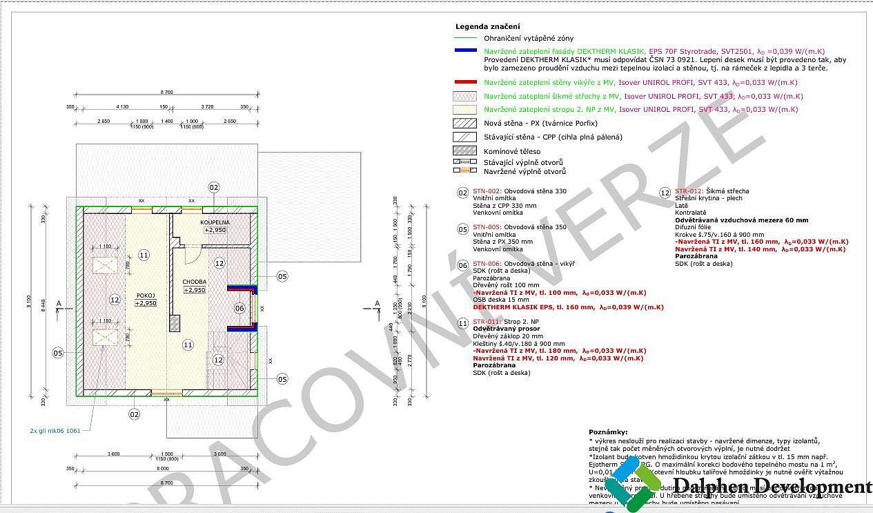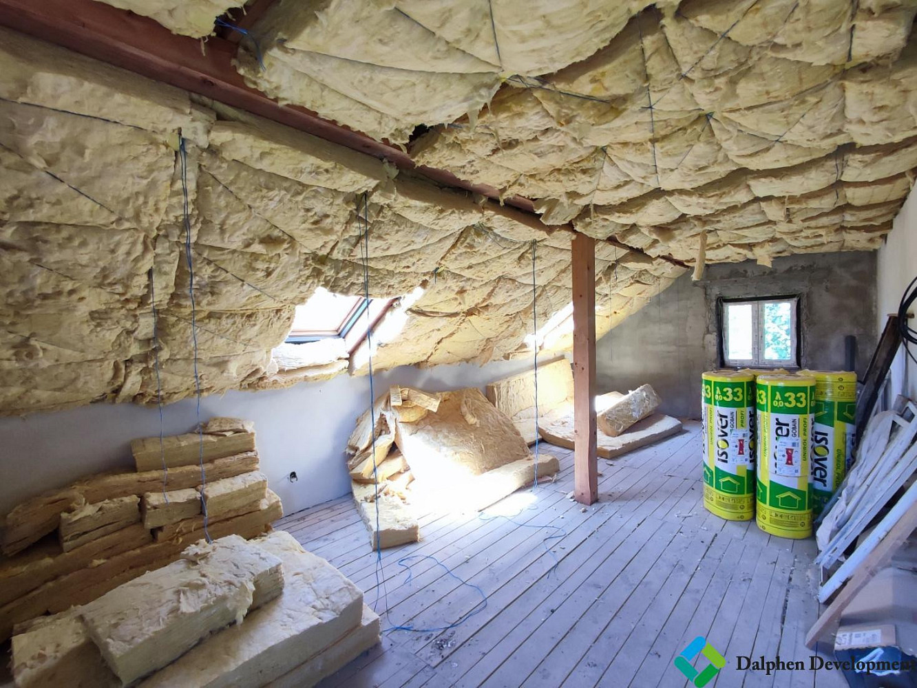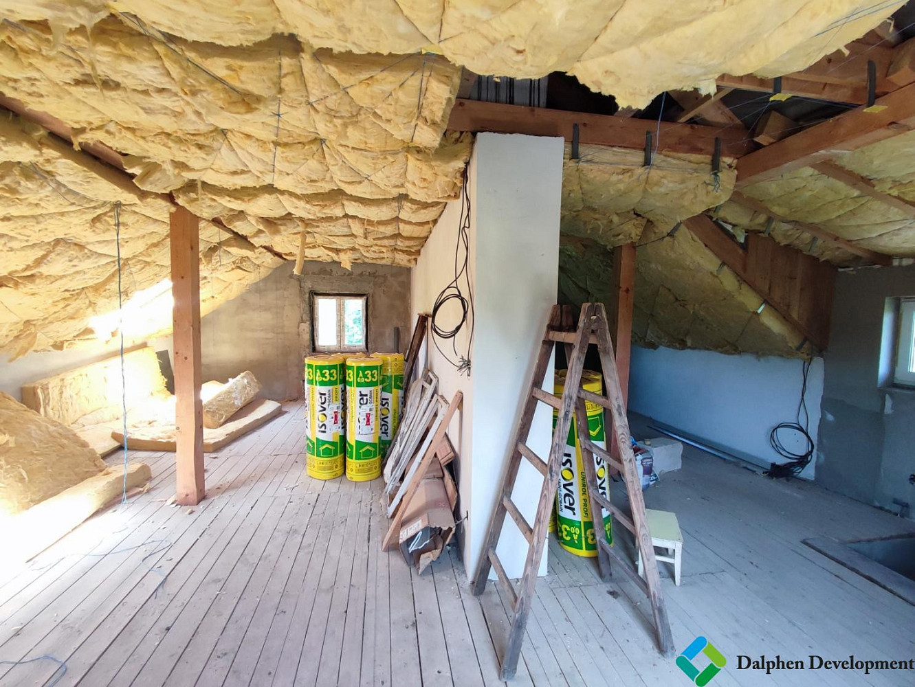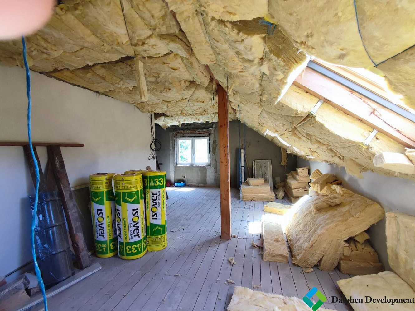- 2. NP: projektované 2 místnosti + koupelna, nyní otevřený prostor- původní konstrukce domu byla zvednuta kvůli světlé výšce a byl udělán věnec, komplet nová střecha - pokryta plechem Satjam, kvalitní dřevěná Velux, tepelná izolace vata Isover je v šikminách, ale neuzavřená SDK.