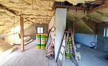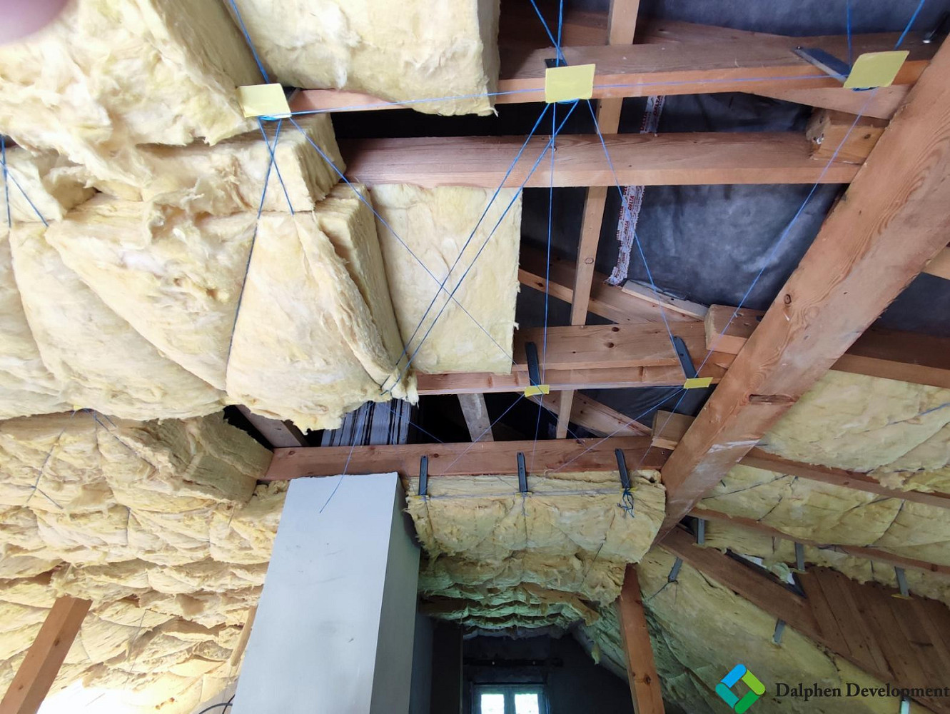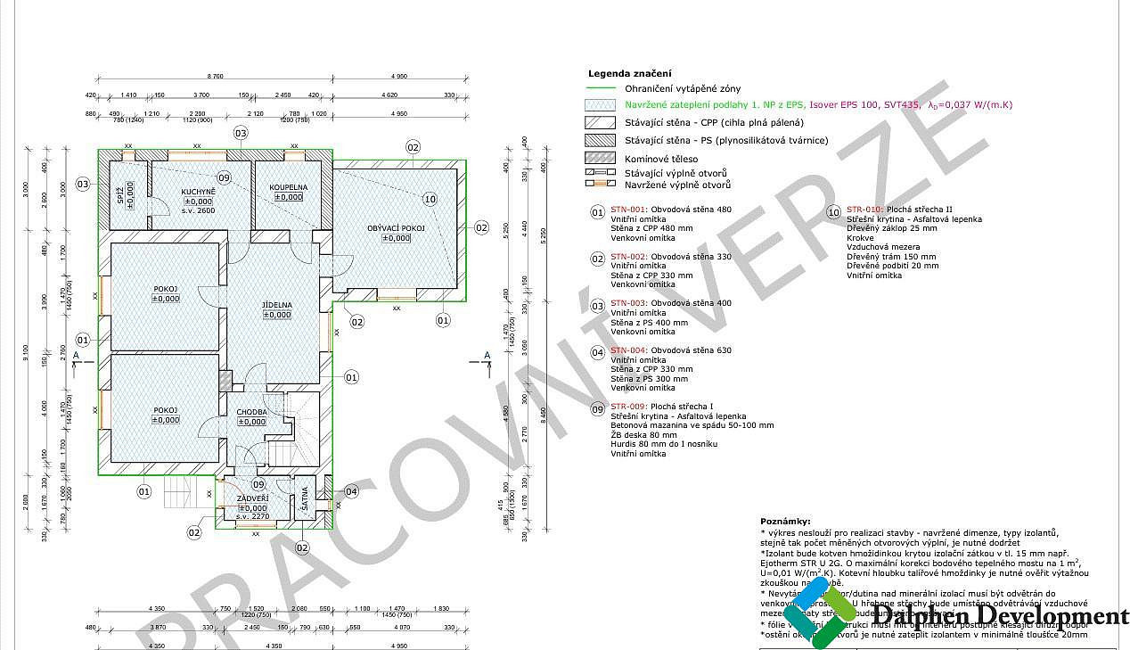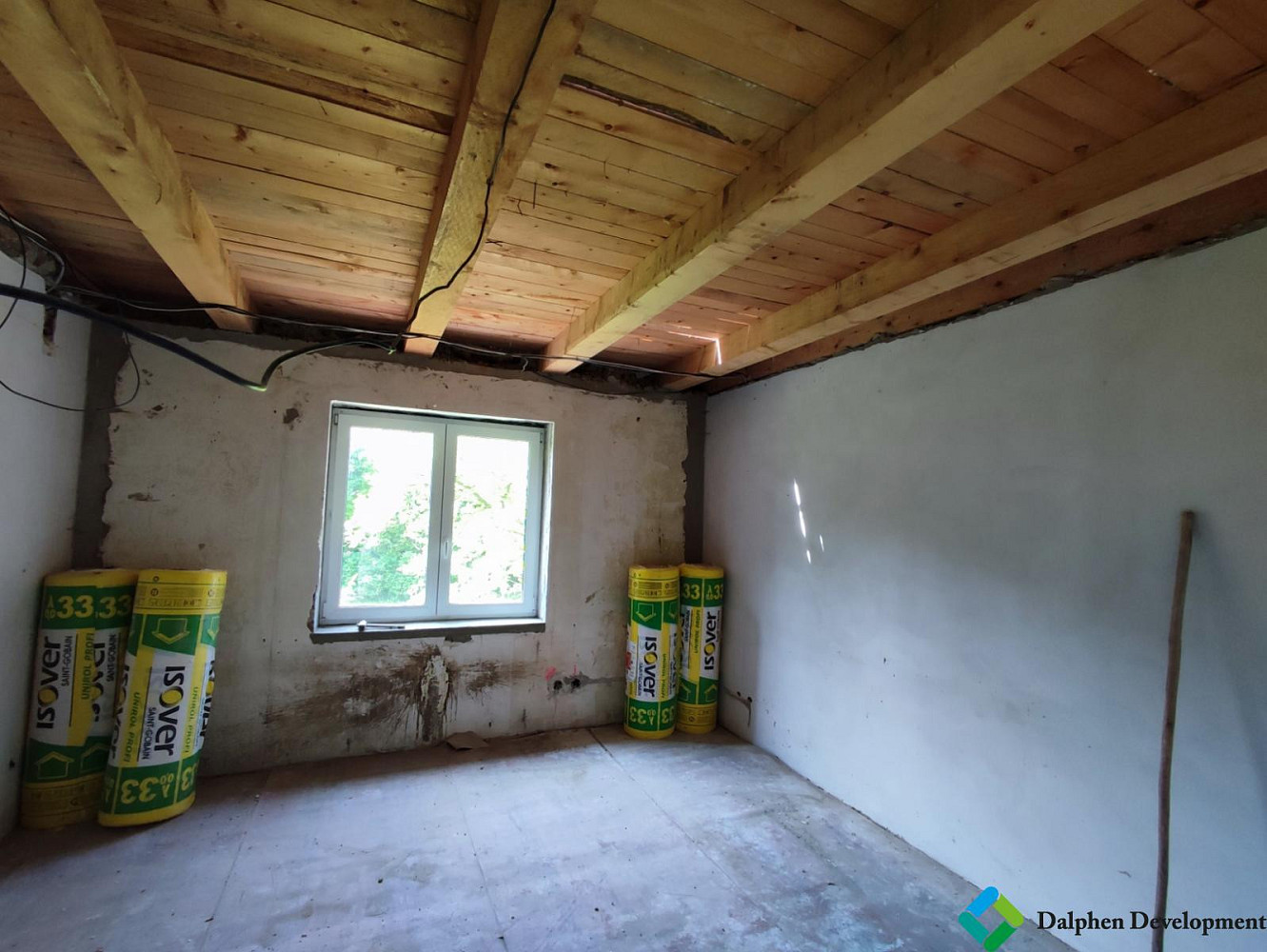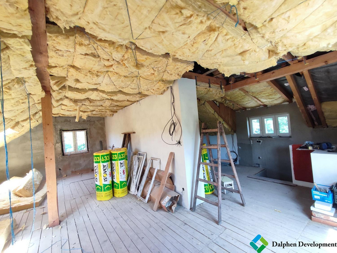 - 2. NP: projektované 2 místnosti + koupelna, nyní otevřený prostor- původní konstrukce domu byla zvednuta kvůli světlé výšce a byl udělán věnec, komplet nová střecha - pokryta plechem Satjam, kvalitní dřevěná Velux, tepelná izolace vata Isover je v šikminách, ale neuzavřená SDK.