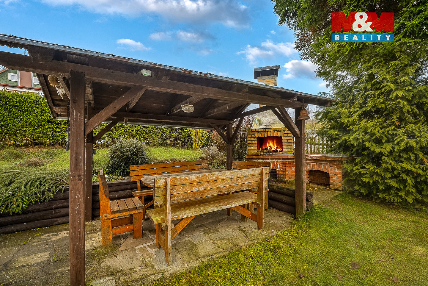 Na pozemku 358 m² se nachází pergola s krbem a zahradní domek, který je ideální pro ukládání náčiní a zahradního nábytku.