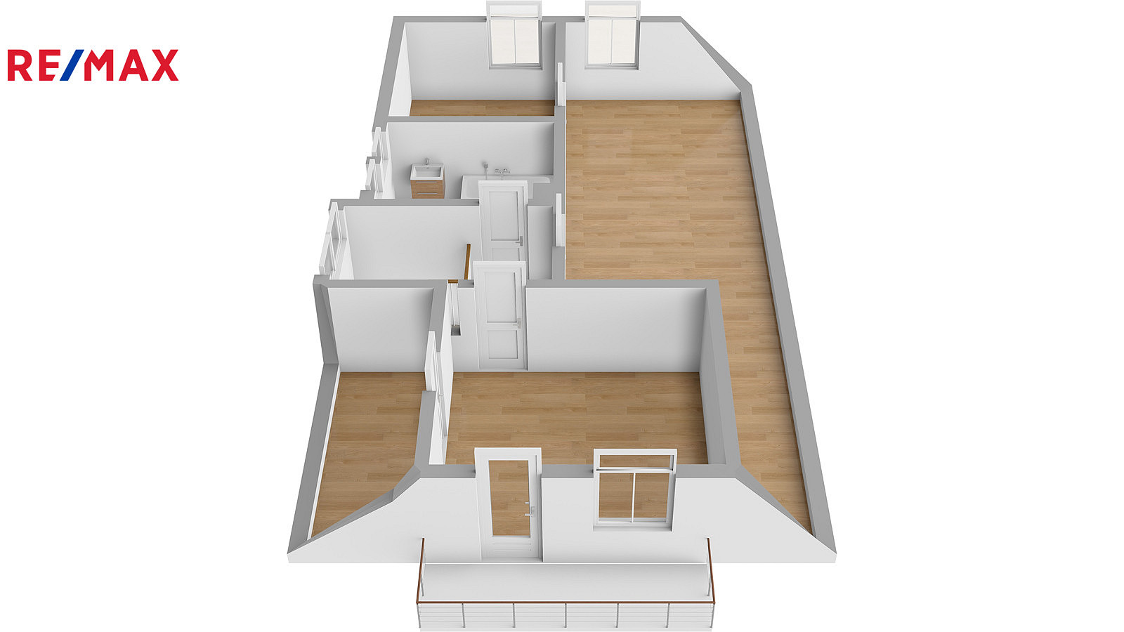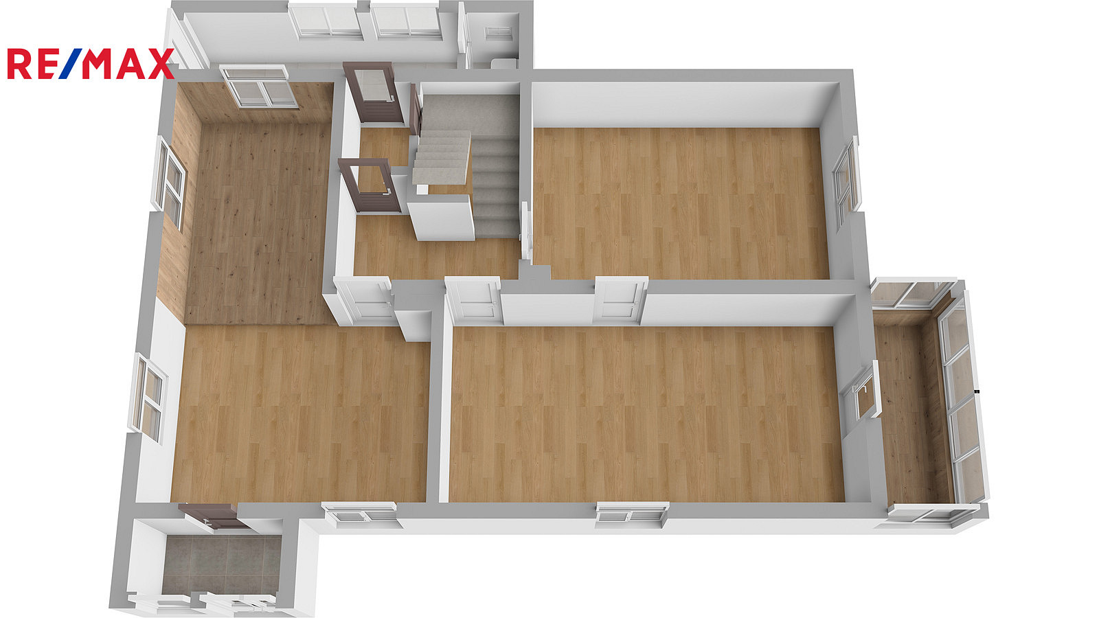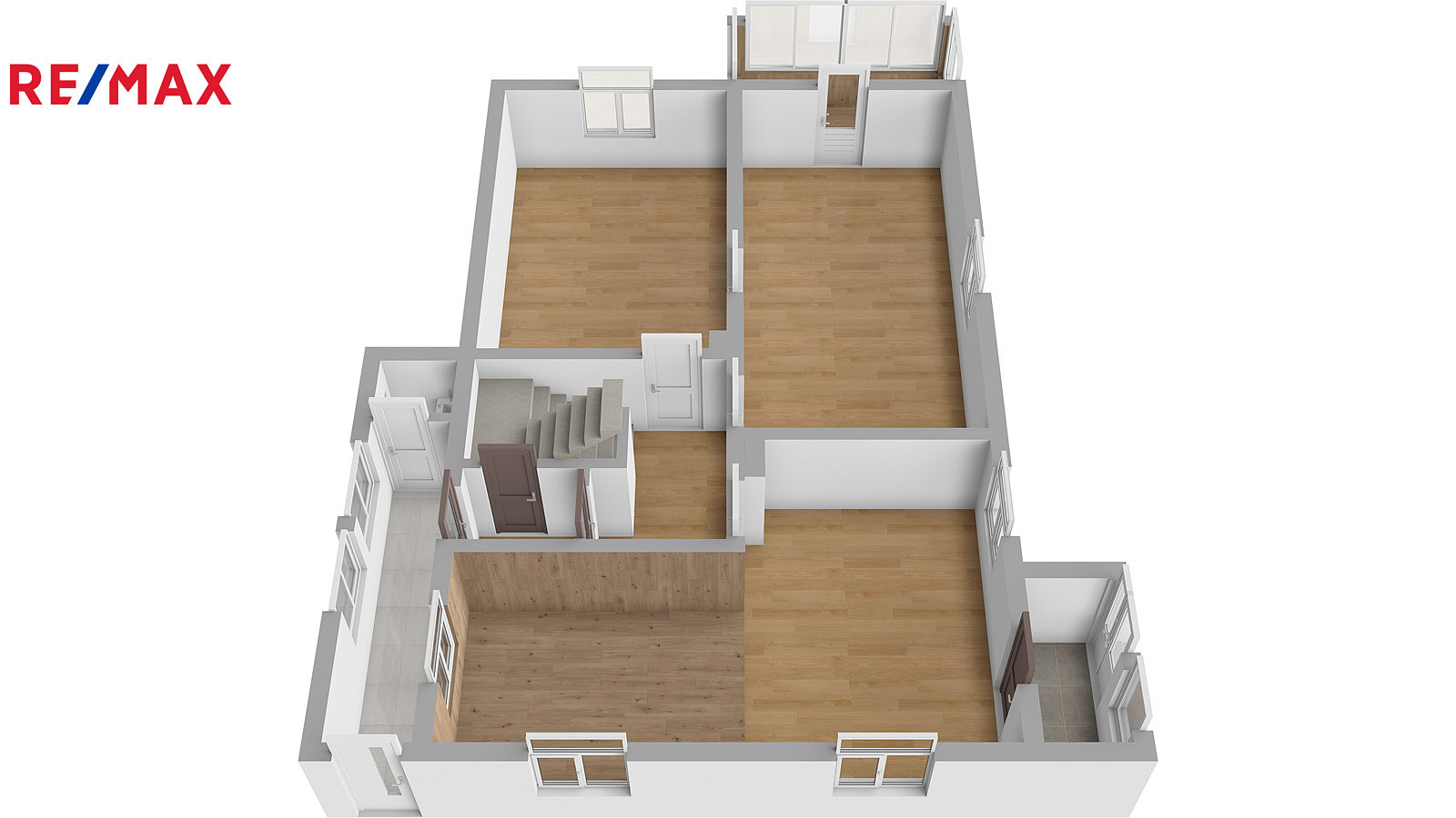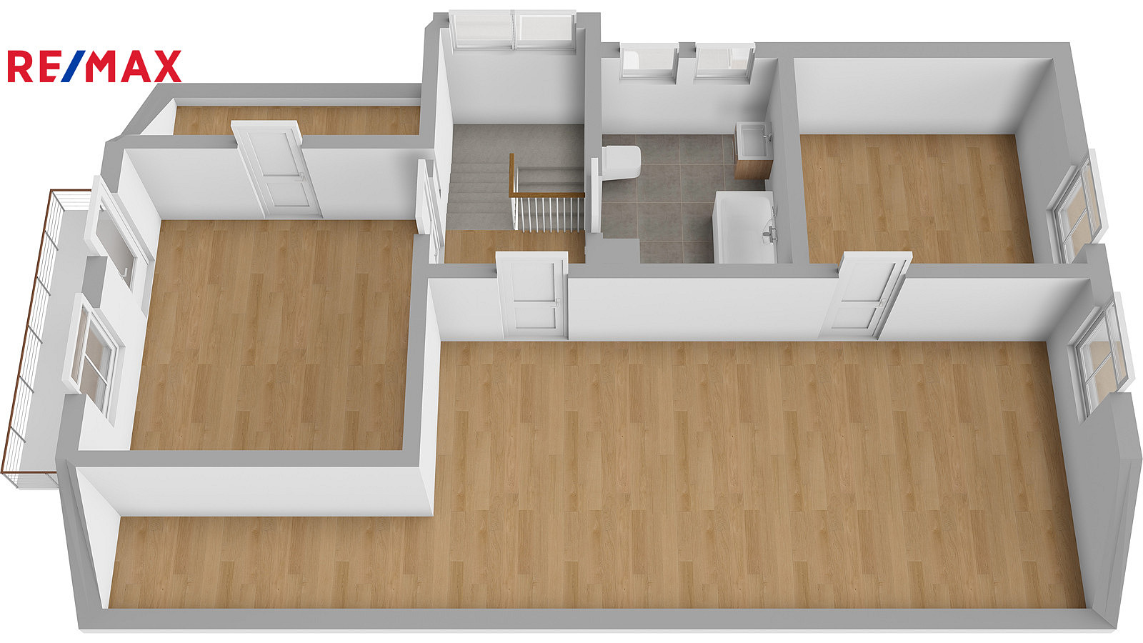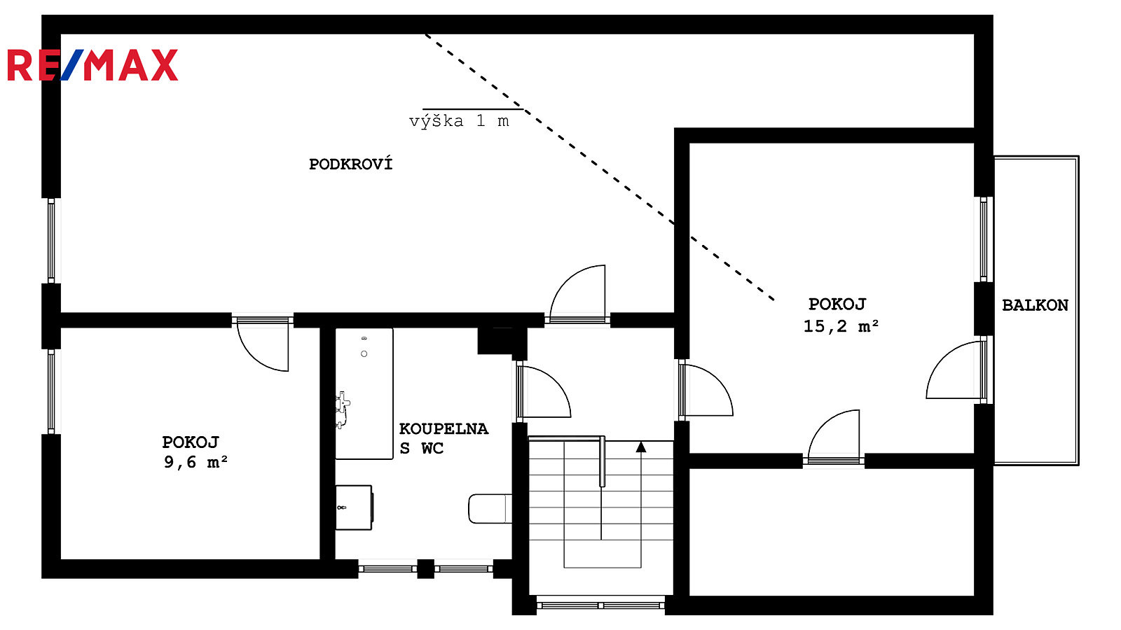 V patře je koupelna, pokoj s balkónem a dvě podkrovní místnosti o užitné ploše 53 m².