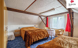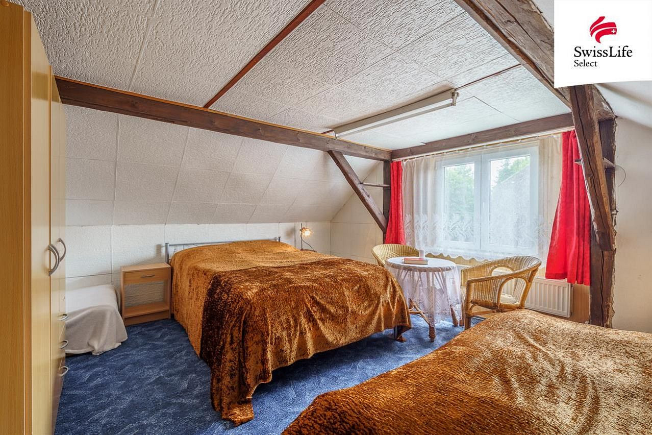 V podkroví je další pokoj, který může sloužit jako pracovna, pokoj pro hosty nebo relaxační prostor.