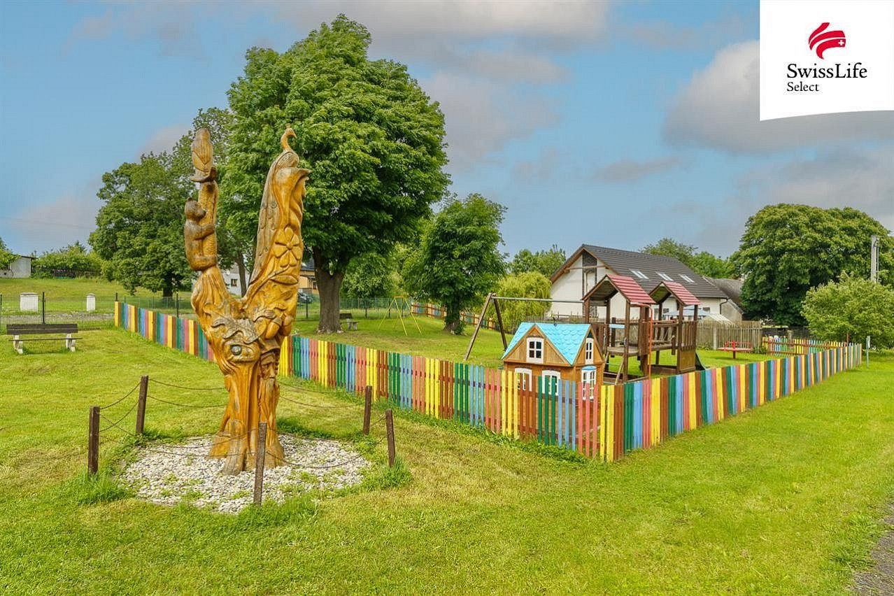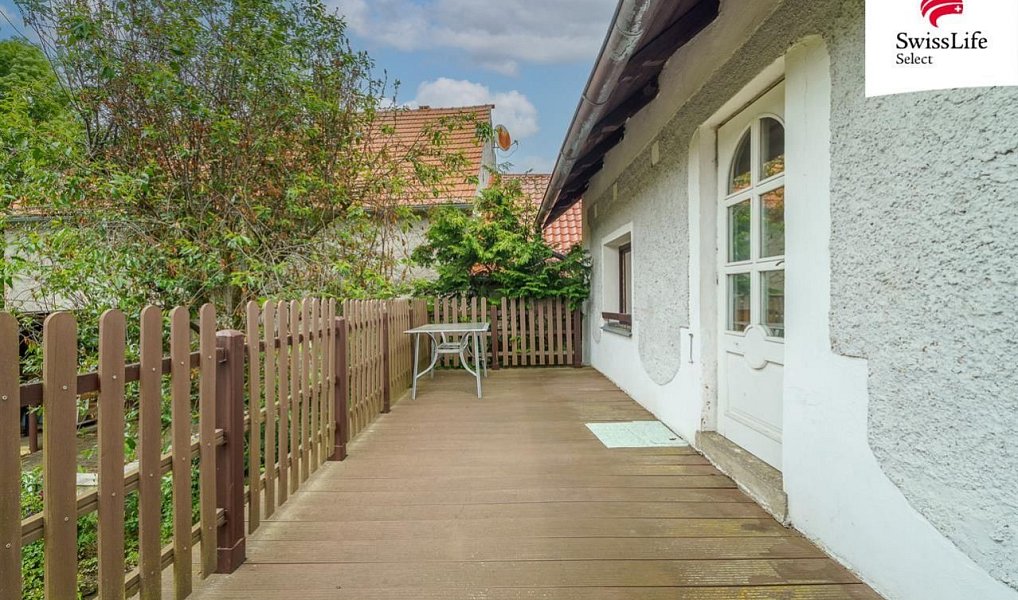 Dům se nachází přímo na návsi. Za bránou je předzahrádka s možností parkování a vjezdem do garáže. Za domem se rozprostírá udržovaná zahrada se zahradním domkem, která vybízí k letnímu posezení, grilování nebo jednoduše k odpočinku.