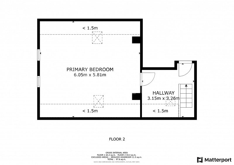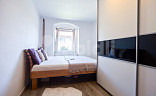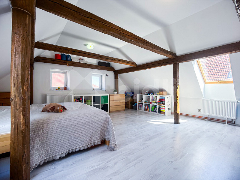 V patře je velký světlý pokoj se střešními okny a přiznané dřevěné trámy vytváří útulný prostor, je zde pracovní kout a toaleta.