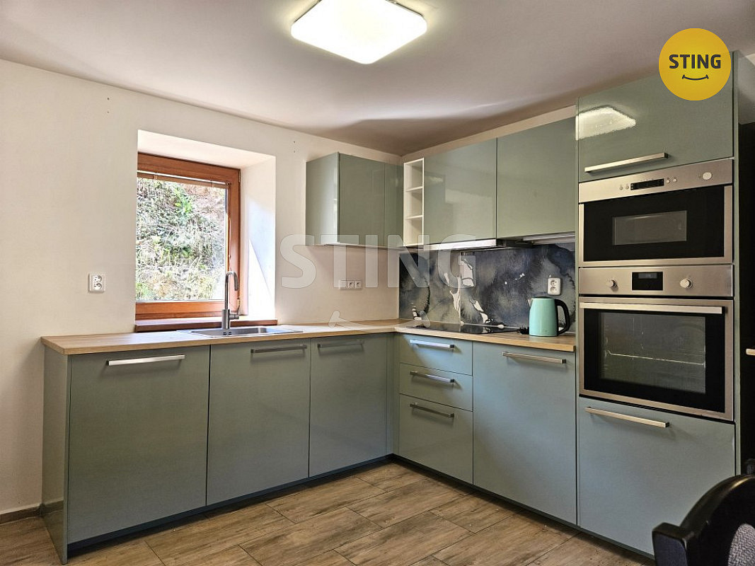 Přízemí tvoří prostorná kuchyně s moderní linkou, obývací pokoj s krbovými kamny napojenými na kotel a radiátory, ložnice s praktickou komorou a koupelna s vanou.