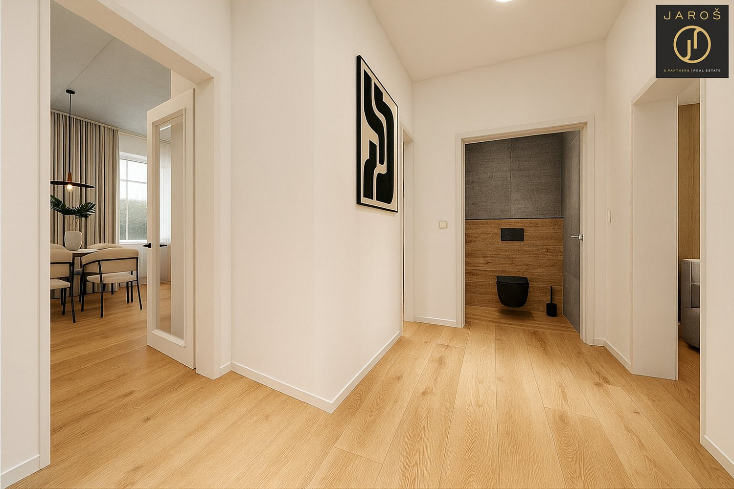 Součástí bytu je také podíl na společných částech rezidence – vlastní wellness zázemí, lyžárna/kolárna a prostorná společná terasa pro posezení a grilování.