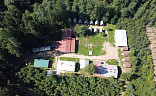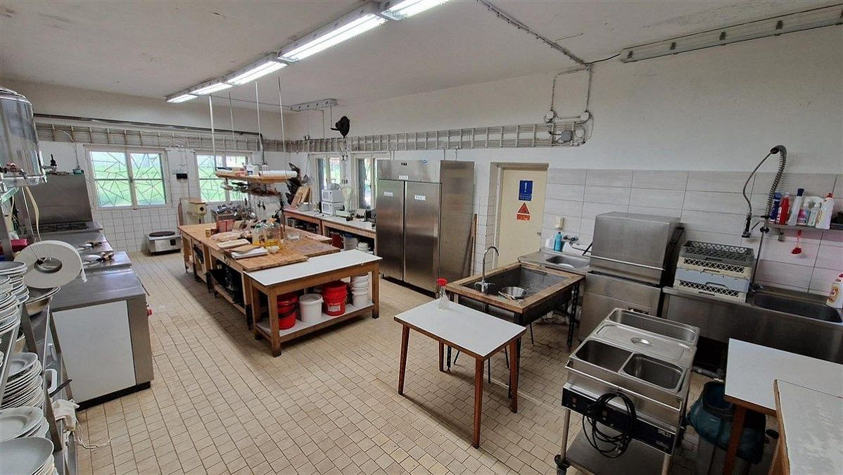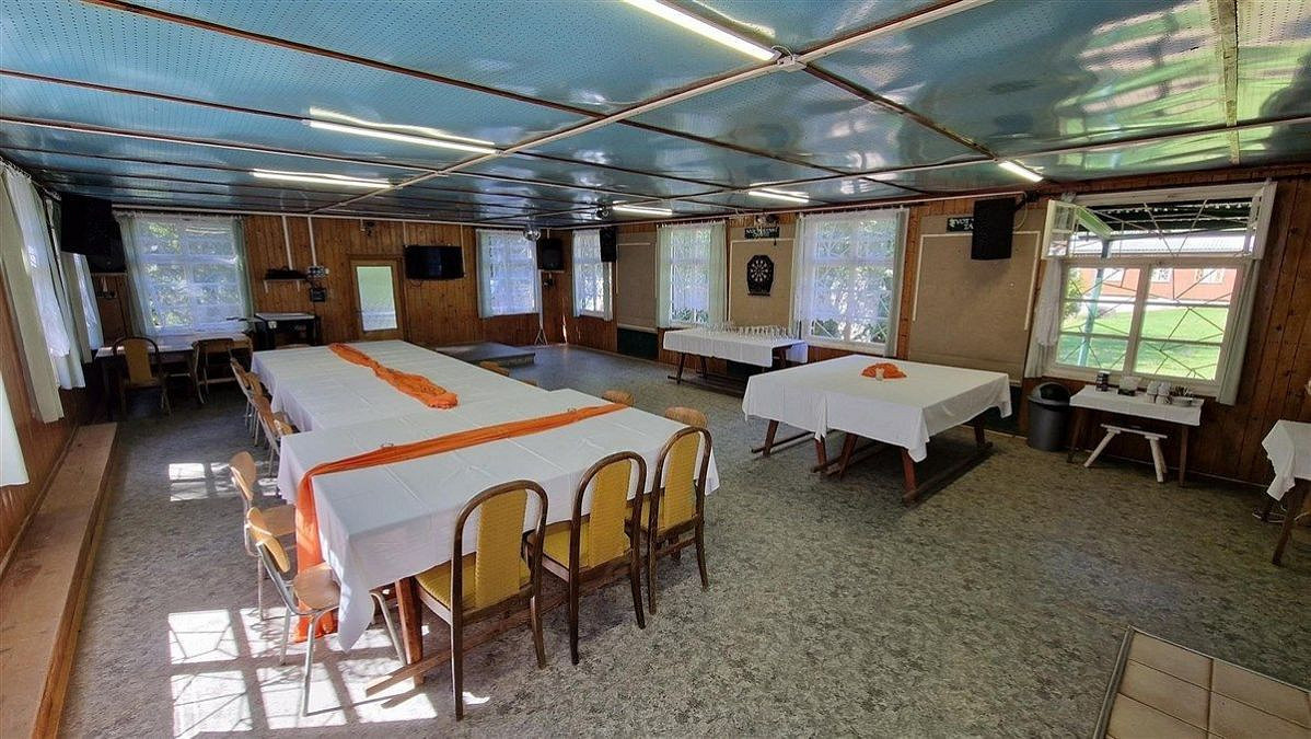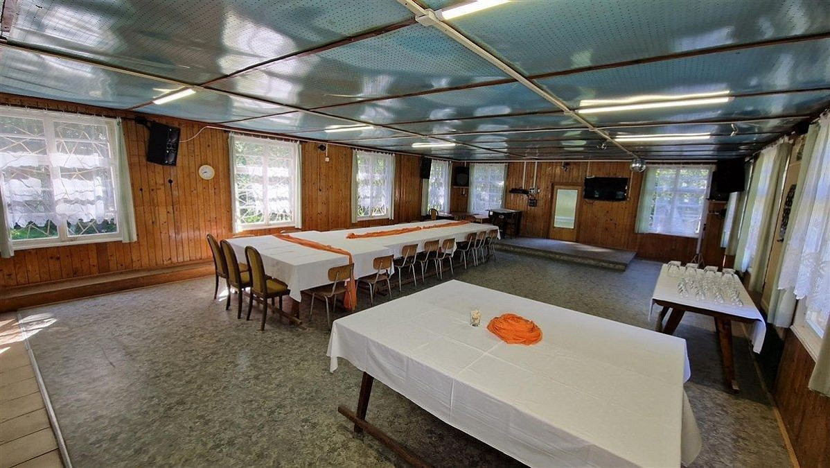 Hlavní budova: společenská místnost s podiem a jídelnou, kapacita 90 míst, zařízená a plně vybavená kuchyně pro celý areál, sklady potravin, umyvárny pro ženy a muže, společné sprchy.