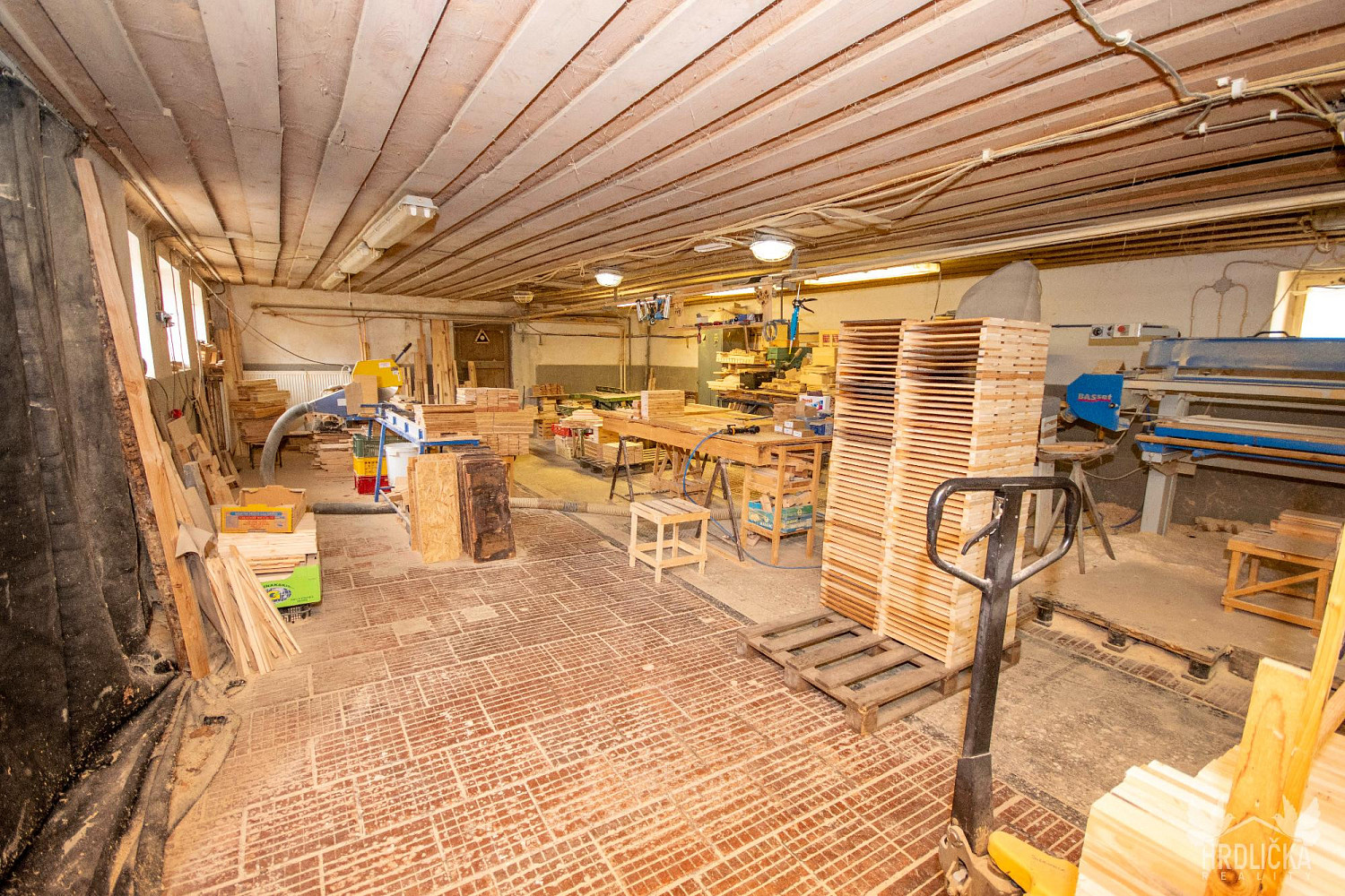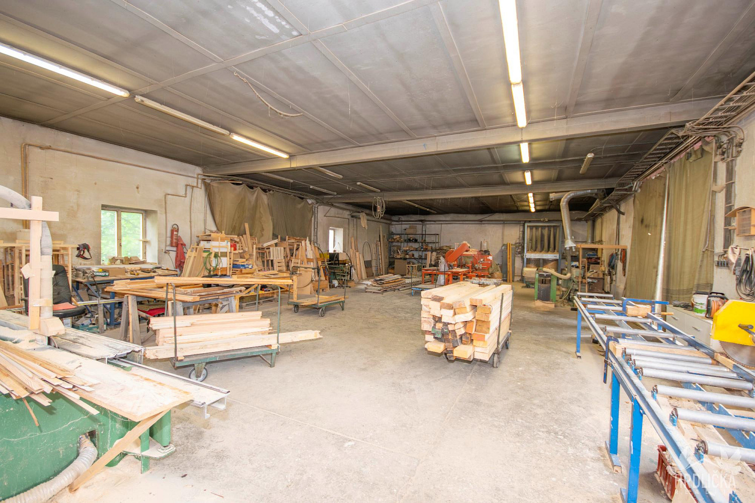 • Hlavní dílna o ploše 214 m² (10,8 × 19,9 m), výška stropu 3,7 m. Betonové pojezdové podlahy, rozvody elektřiny, vzduchotechnika pro odsávání pilin. Vytápění zajištěno ústředními radiátory, napojenými na kotel na tuhá paliva - kotelna (12,6 m²).