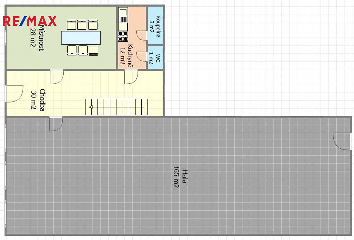 - 1. NP - vstupní chodba, hala 165m², místnost 28m², kuchyňský kout, sprcha a toaleta,