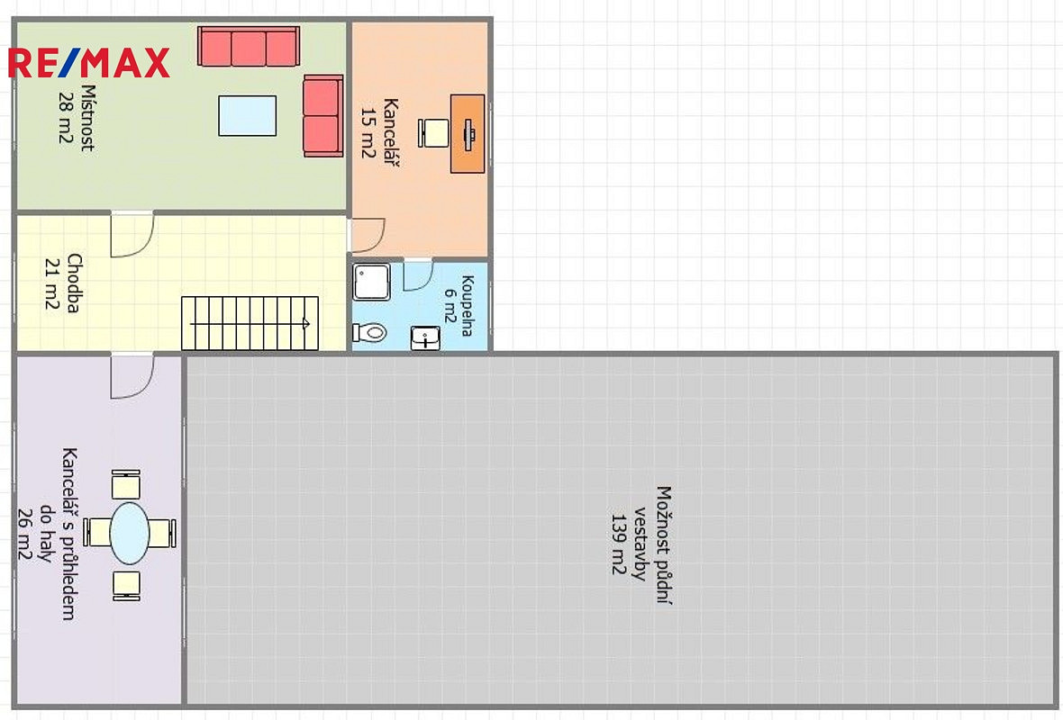 - 2. NP - chodba, kancelář s průhledem do haly 26m², kancelář se sprchou a toaletou 15m², místnost 28m²,