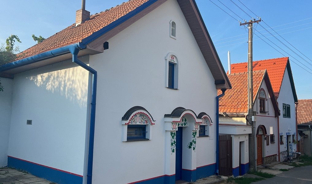 Typický prvek vstupní průčelí zvané „Žůdro“ a tradiční malování slováckými ornamenty - to tento vinný sklep splňuje.