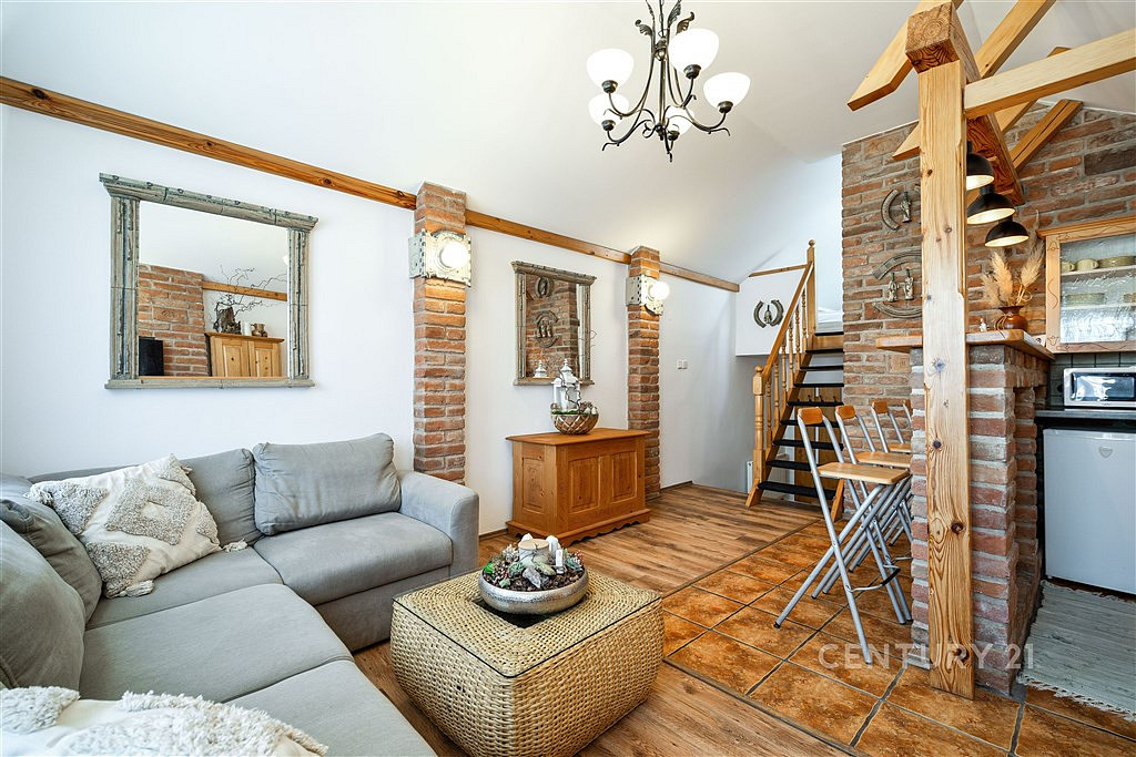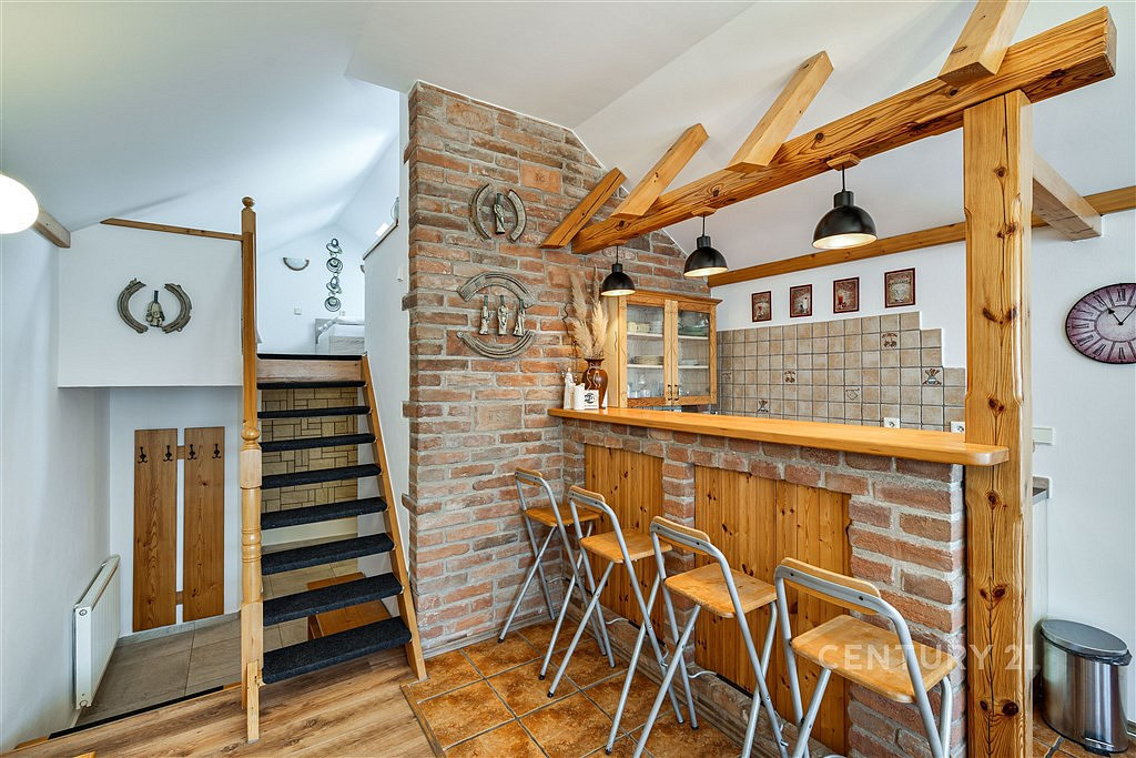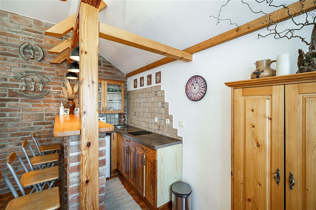 Horní patro: 5–7 lůžek, plně vybavená kuchyně, samostatné WC a koupelna