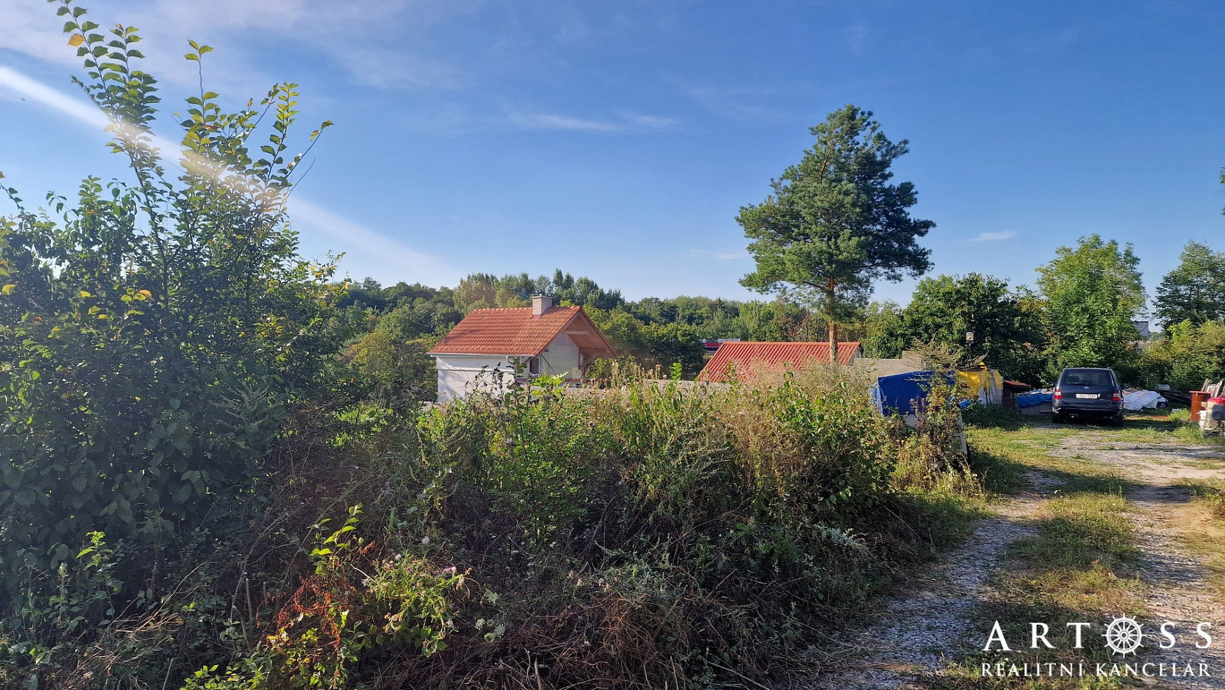 Pozemek je v současné době neudržovaný, zarostlý plevelem a náletovými dřevinami. Betonová zeď na levé straně je součástí pozemku, stejně jako nezpevněná cesta, která je zobrazená na přiložených fotografiích. K dispozici je také přístup ze zadní strany po polní cestě. Na pozemku se nachází vrtaná studna s atestem potvrzujícím kvalitu pitné vody. Přípojka elektřiny je na hranici pozemku.