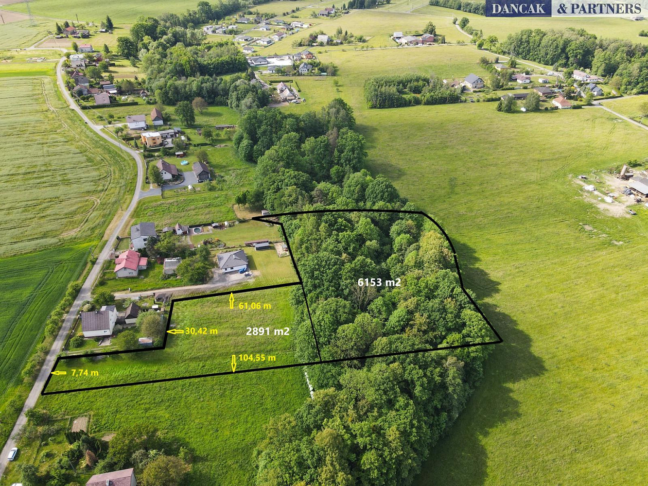 Nabídka koupě nemovitosti, stavebního pozemku s výměrou 2891m² a lesního pozemku o rozloze 6153 m². Cena za nemovitost je pouze za stavební část, les je jako bonus v ceně stavební parcely.