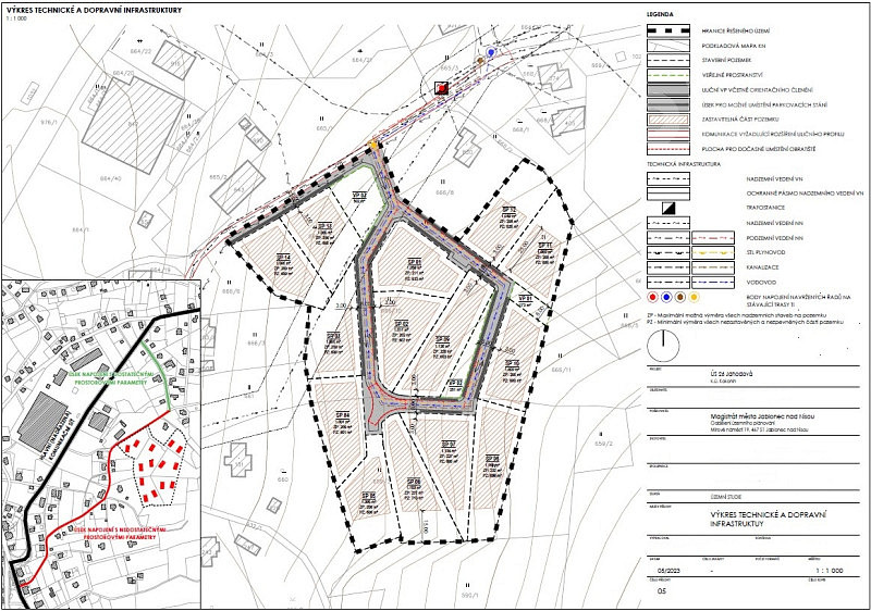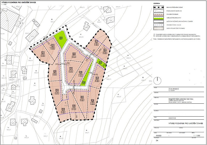 Schválená Územní studie ÚS26 stanovuje podmínky využití BP2 - bydlení příměstské. Daný regulativ umožňuje na pozemcích s min. výměrou 1000 m² výstavbu rodinných či bytových domů a souvisejících staveb, s max. 20% zastavitelností pozemku stavbami, 20% podílem zpevněných ploch a min. 60% podílem zeleně pro však dešťových vod. Výšková hladina zástavby je stanovena na max. 2 celá nadzemní podlaží + 1 ukončující podlaží, vždy s konstrukční výškou podlaží max. 4m, současně max. celkové výšce 12m, výška staveb se měří od nejnižšího místa styku stavby s terénem k hřebeni střechy / nejvyšší hraně atiky. Maximální výška oplocení je 1,7 m; maximální výška podezdívky oplocení je 0,5 m. Grafické znázornění této lokality je přiloženo ve fotogalerii.