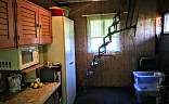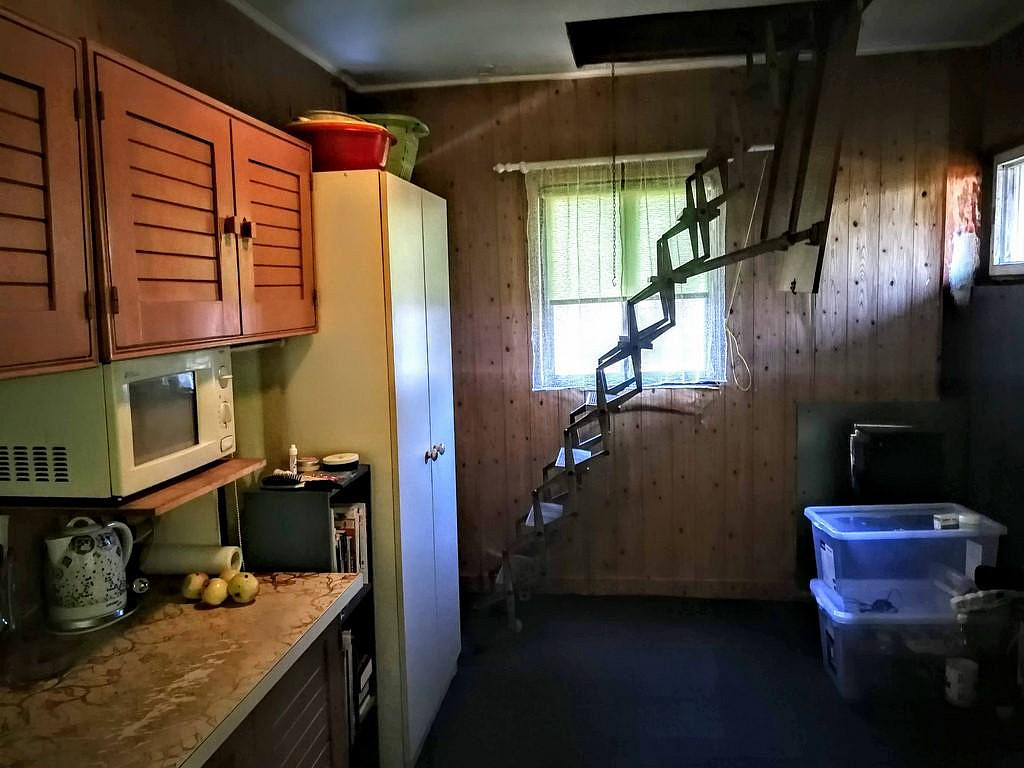 Na zahradě je chatka s podsklepením. Velké stromy jsou pokáceny.