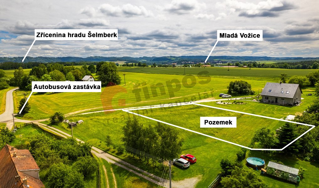 Prodej nádherné stavební parcely s výhledem 1702 m², v Chocově u Mladé Vožice, 20 km od Tábora, 50 m