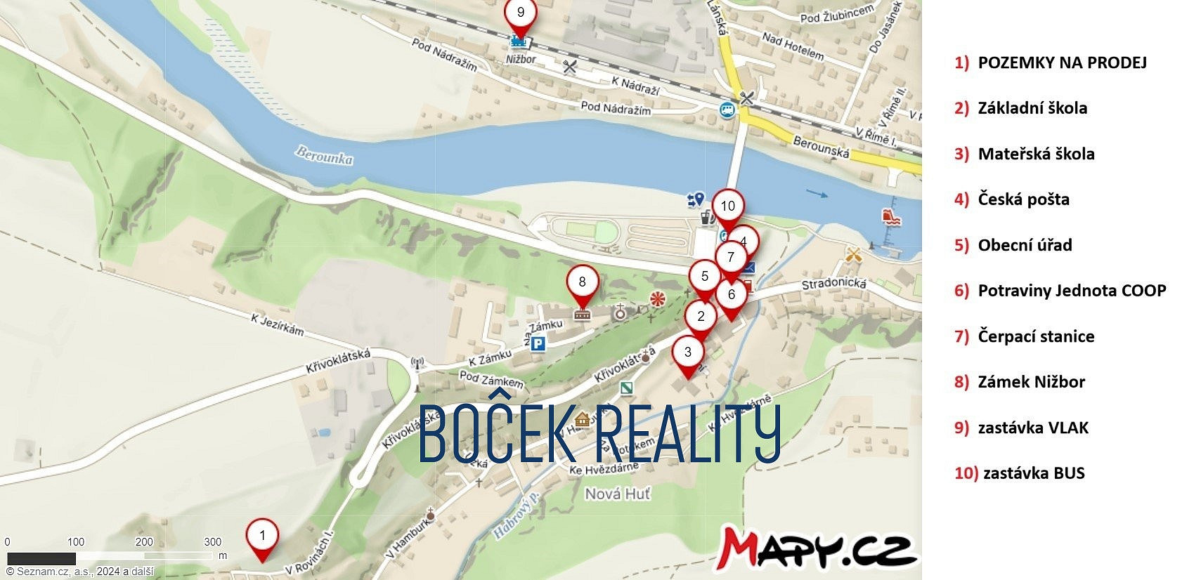 Veškeré inženýrské sítě (elektřina, plyn, voda a kanalizace) jsou vedeny při hranici těchto pozemků. V rámci prodeje je zde možnost zakoupit oba pozemky o stejné výměře, čímž získáte ještě více prostoru pro Vaše nápady a realizaci Vašich plánů. Díky vynikající dopravní dostupnosti do Prahy a okolních měst je tato lokalita ideální pro celoroční bydlení. V obci Nižbor je zajištěna základní občanská vybavenost (škola, školka, obchody, restaurace, cukrárny, čerpací stanice, sklárna, cyklostezka, tělocvična, lékař). V obci Nižbor zasazené do krásné přírody křivoklátských lesů a povodí řeky Berounky se nachází zámek Nižbor s centrem keltské kultury kde se v průběhu roku koná mnoho kulturních a společenských akcí. Velmi dobrá dostupnost do města Beroun 9,5 km a Praha Zličín 28 km.