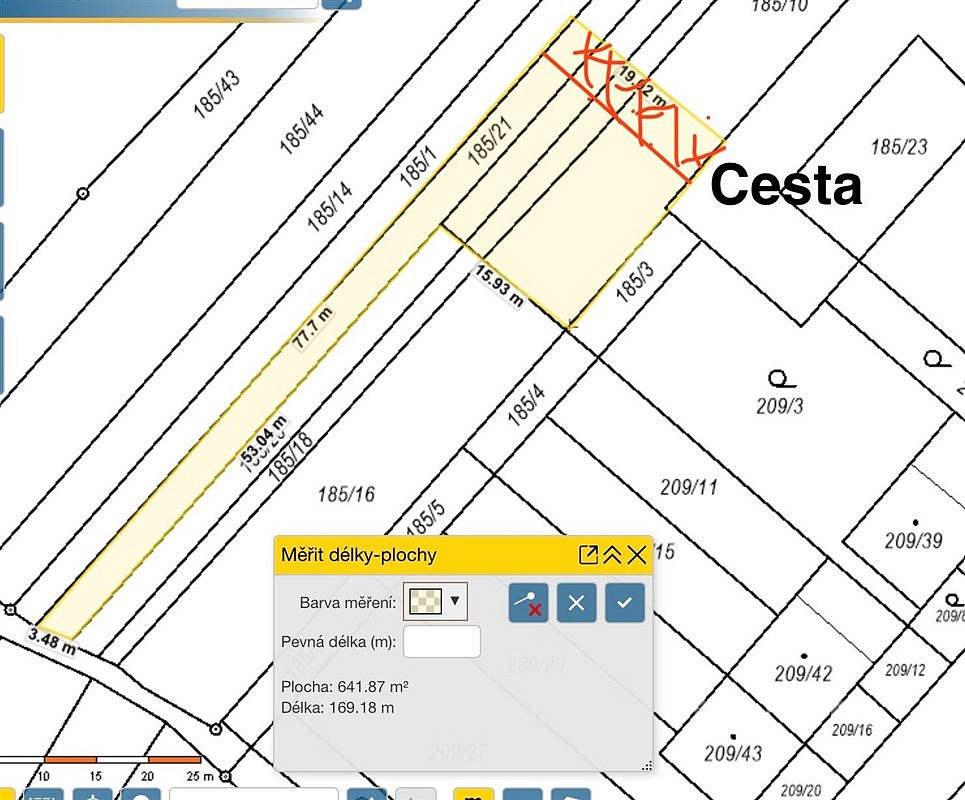 Rozměry pozemku jsou pravidelná část 18x23 plus další části (viz obrázky v inzerci).