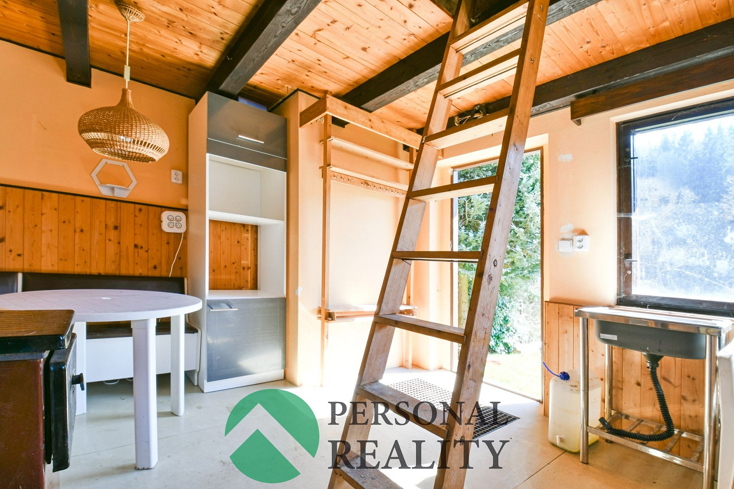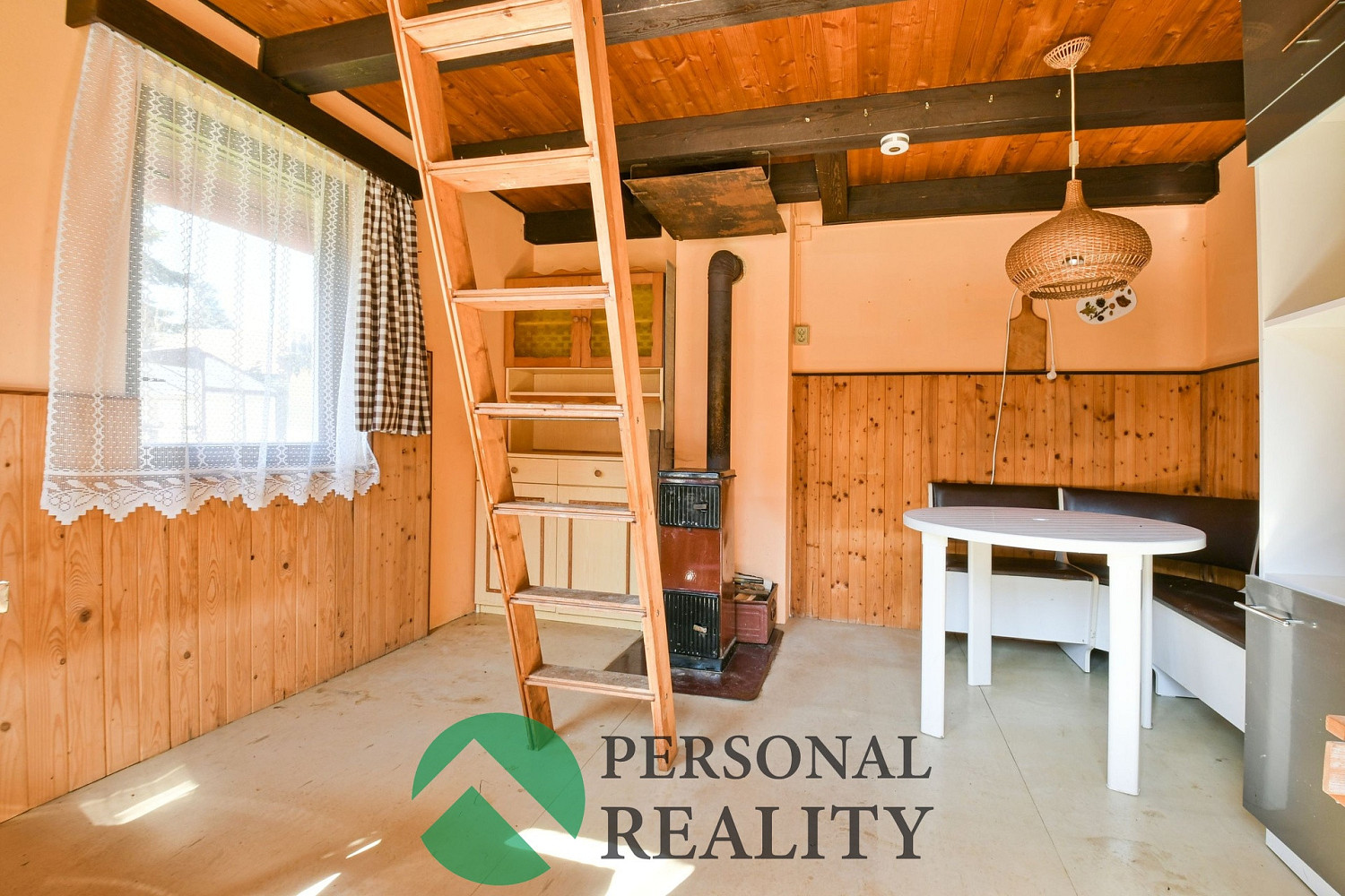 V přízemí chaty se nachází obývací prostor s kamny, jídelní kout a úložné skříňky.