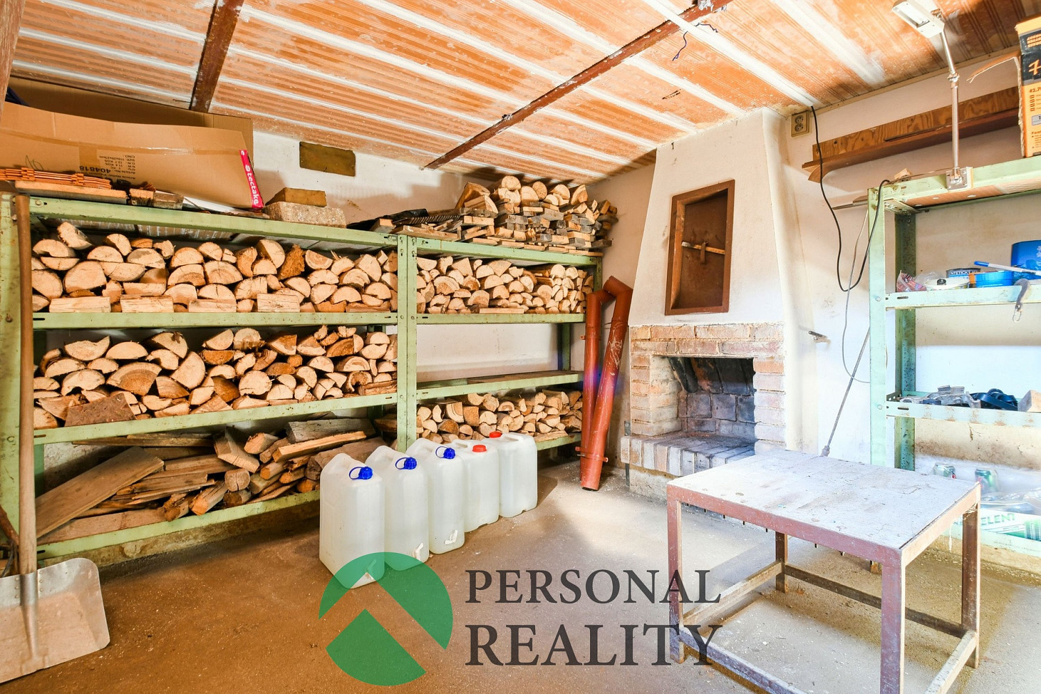 Ve sklepě je krb, další studna s užitkovou vodou a prostor s kovovými regály – ideální pro skladování, či jako dílna.