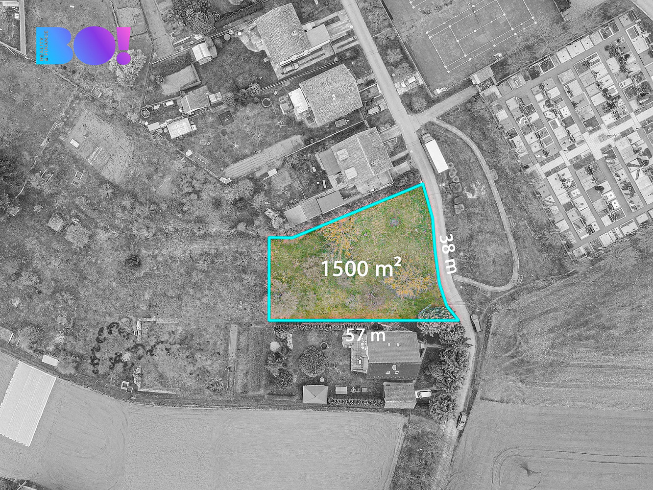 Momentálně se nabízený pozemek nachází na parcele o rozloze 3960 m². Tato parcela bude posléze rozdělena geodetickým zaměřením a to buď na dvě parcely o ploše 750 m², nebo jednu parcelu 1500 m². Zbylou část si současní vlastníci ponechají k užívání.