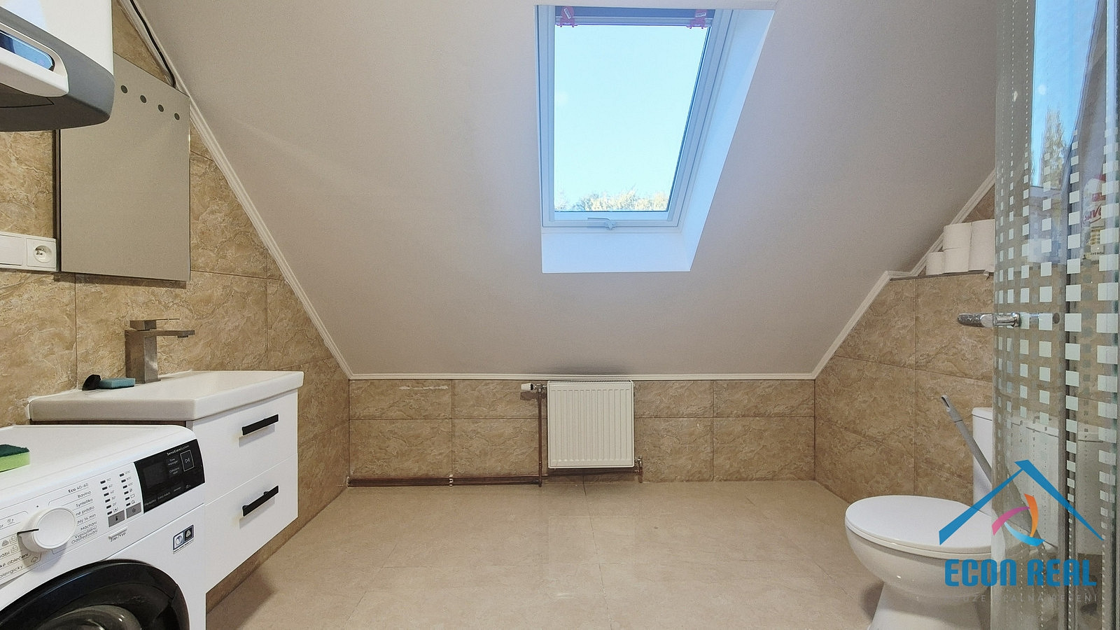 Byt 2kk disponuje větší předsíní, ze které lze vstoupit do zcela nové koupelny se sprchovým koutem, toaletou, umyvadlem se zrcadlem, bojlerem na ohřev teplé vody a pračkou, na odpočinkovou terasu s výměrou 32 m² nebo do obývacího pokoje s plně vybaveným kuchyňským koutem. Podkrovní ložnice je přístupná z obývacího pokoje pomocí schodů.