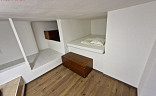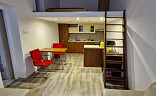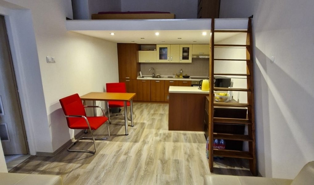 Dispozice 1+1 s mezonetovým řešením – chytře uspořádaný obytný prostor s kuchyňským koutem a schodištěm na horní spaní.