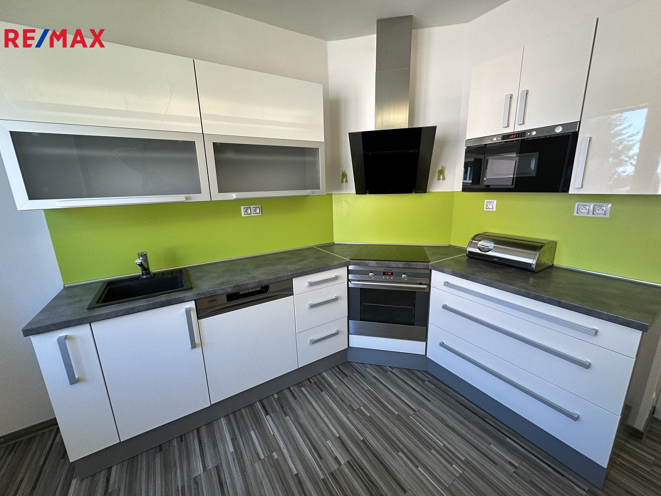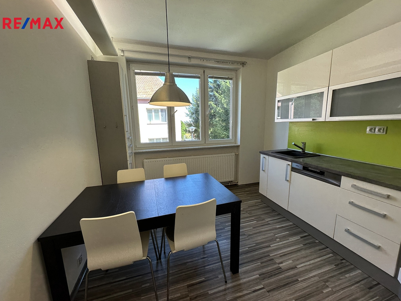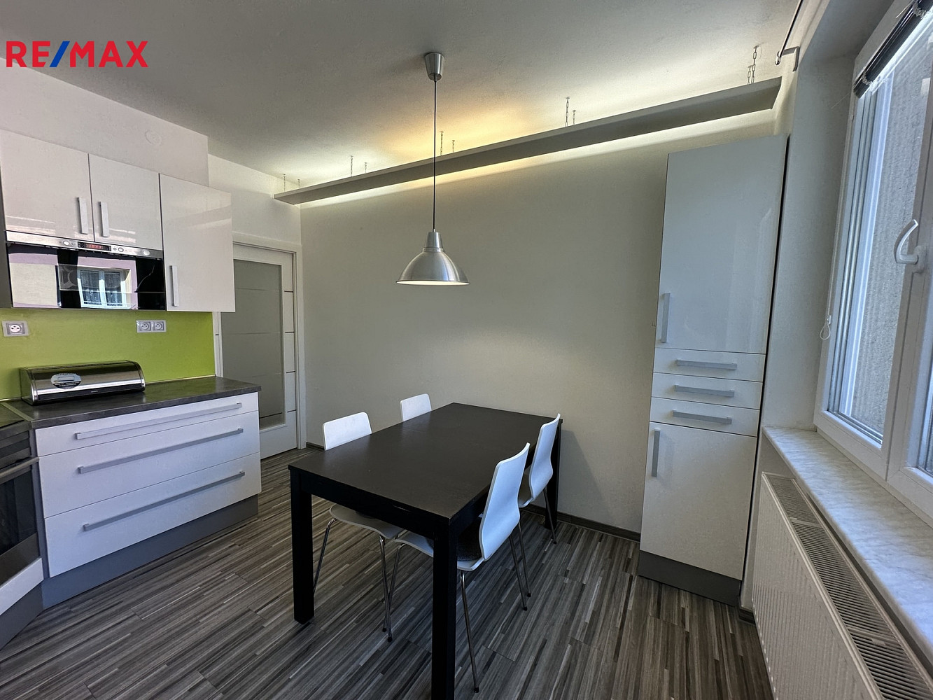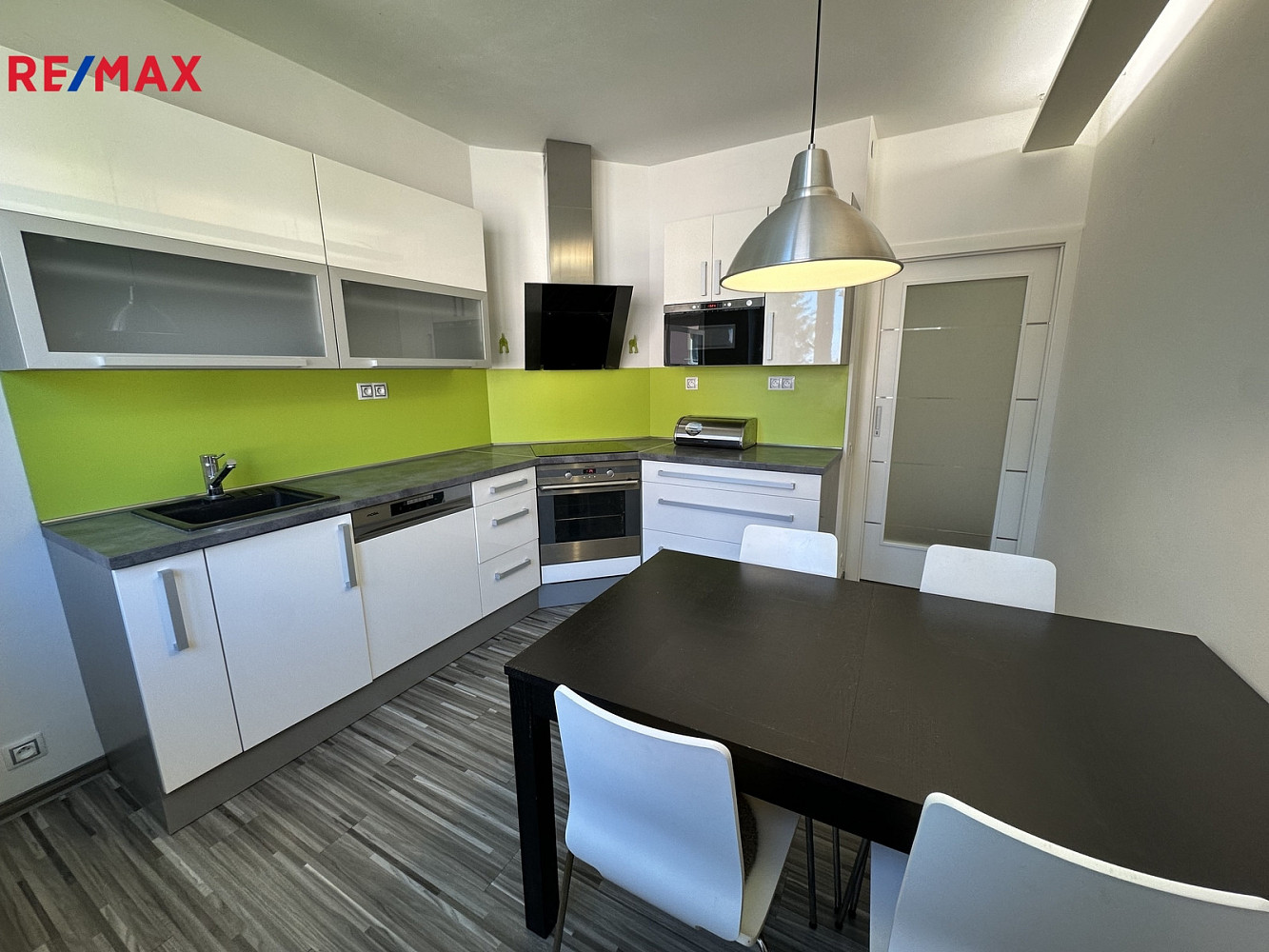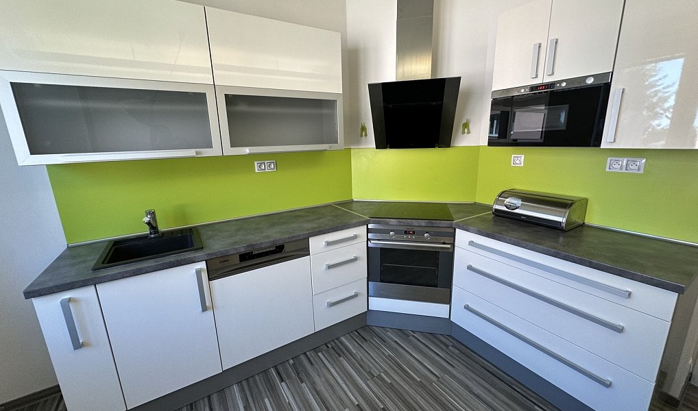 Prostorná kuchyně je vybavena rohovou kuchyňskou linkou s vestavěnými spotřebiči ( myčka MORA, elektrická trouba a indukční varná deska Elektrolux, mikrovlnná trouba a odsavač par) a jídelním stolem se 4 židlemi.