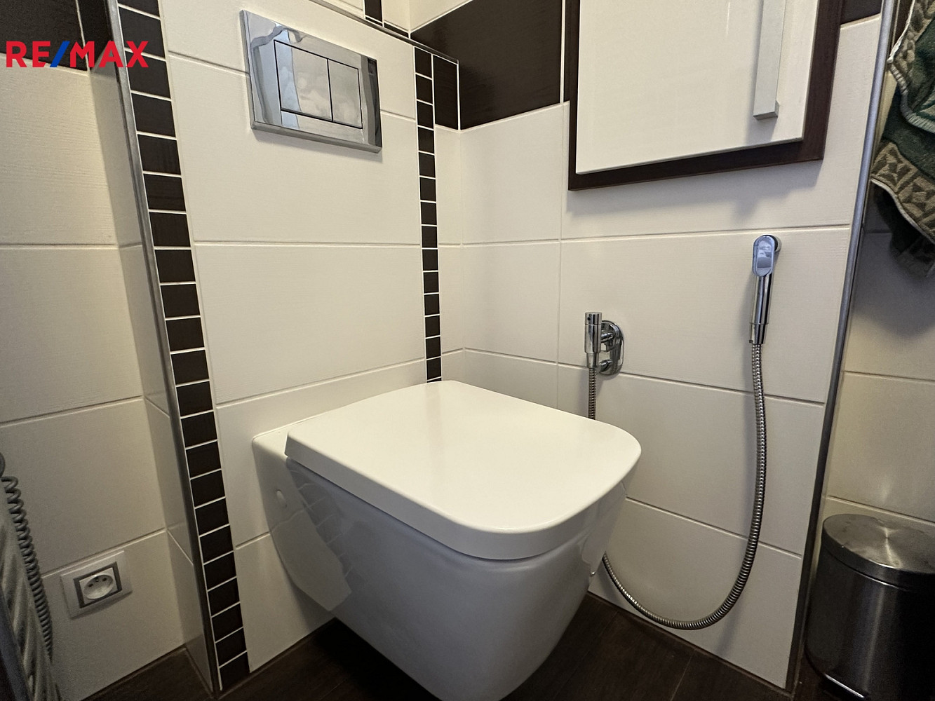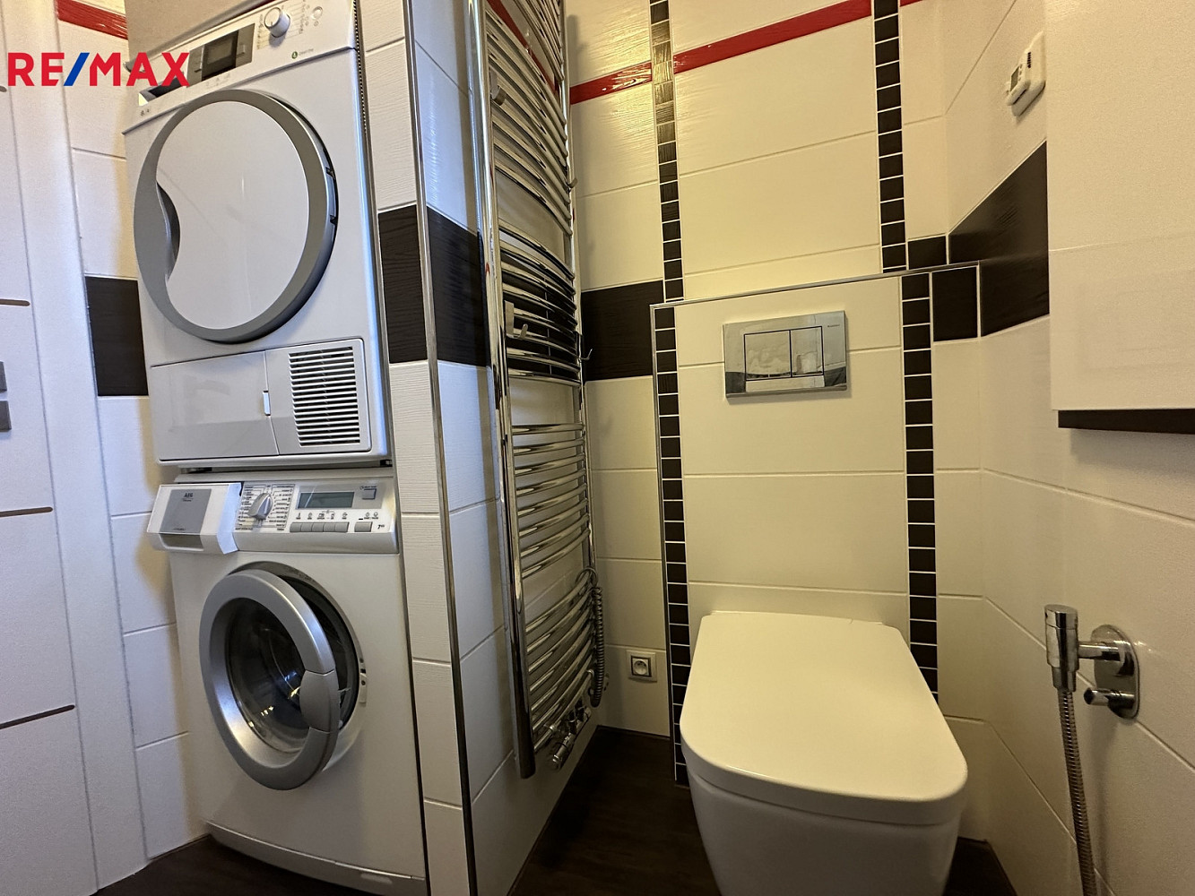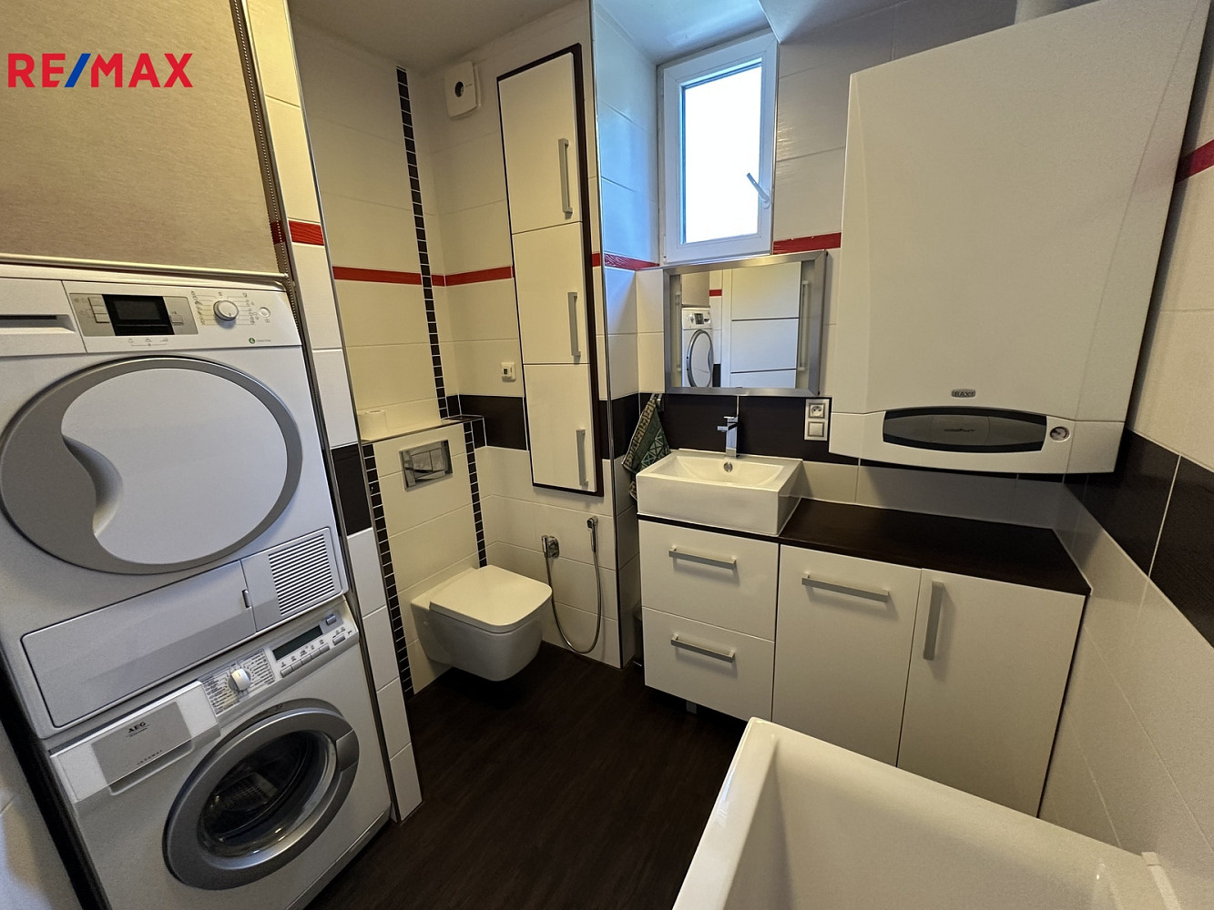 Koupelna je vybavena rohovou vanou se skleněnou zástěnou pro sprchování, nástěnnou i podomítkovou sprchou, závěsnou toaletou Geberit , koupelnovým nábytkem s umývadlem, pračkou AEG, sušičkou BECO a je zde umístěn kotel značky BAXI.
