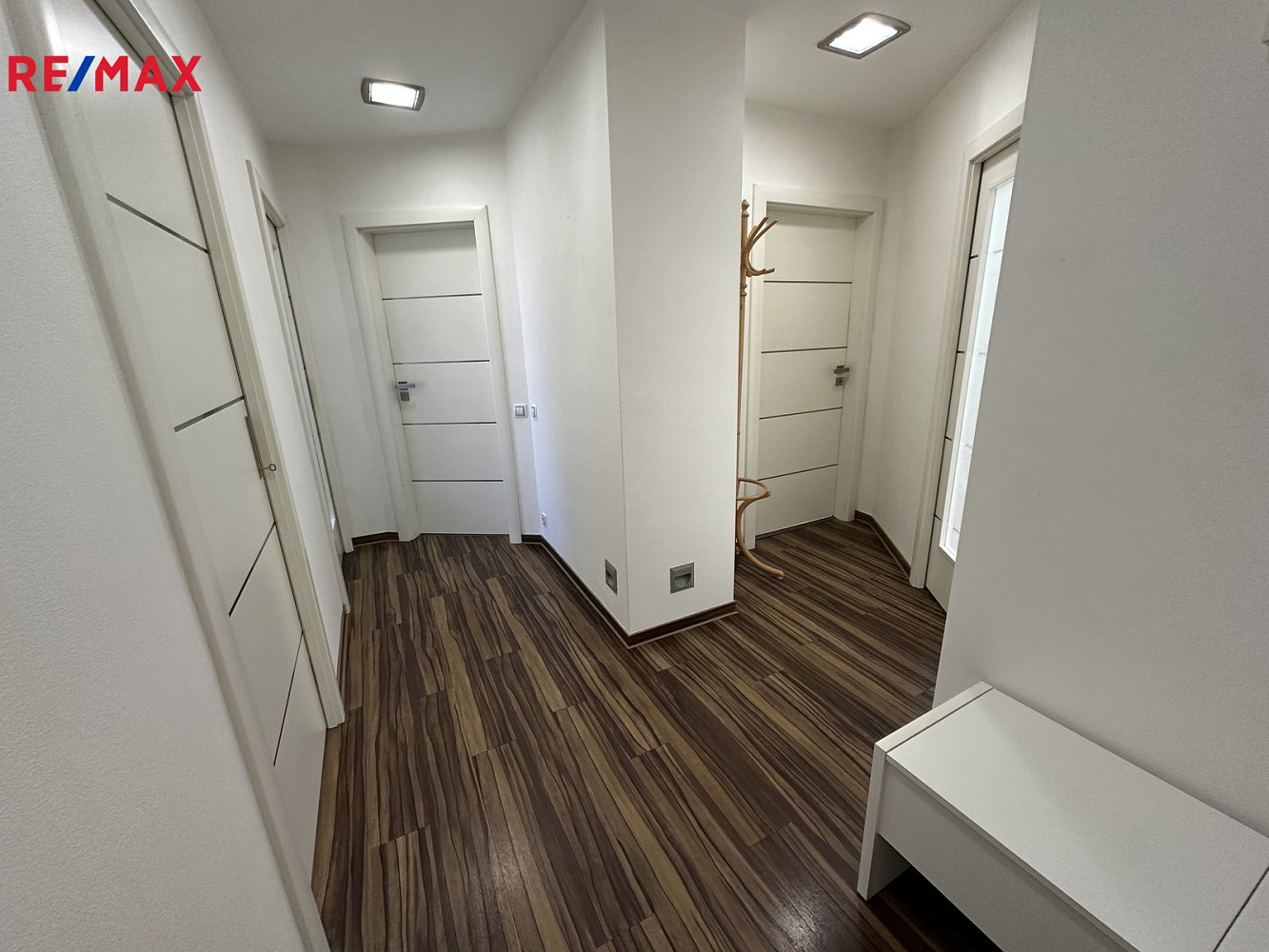 Byt je velmi zdařile dispozičně vyřešen. Z předsíně jsou samostatné vstupy do ložnice ( s prostornou rohovou šatní skříní ), kuchyně, koupelny s toaletou, dětského a obývacího pokoje.