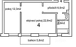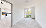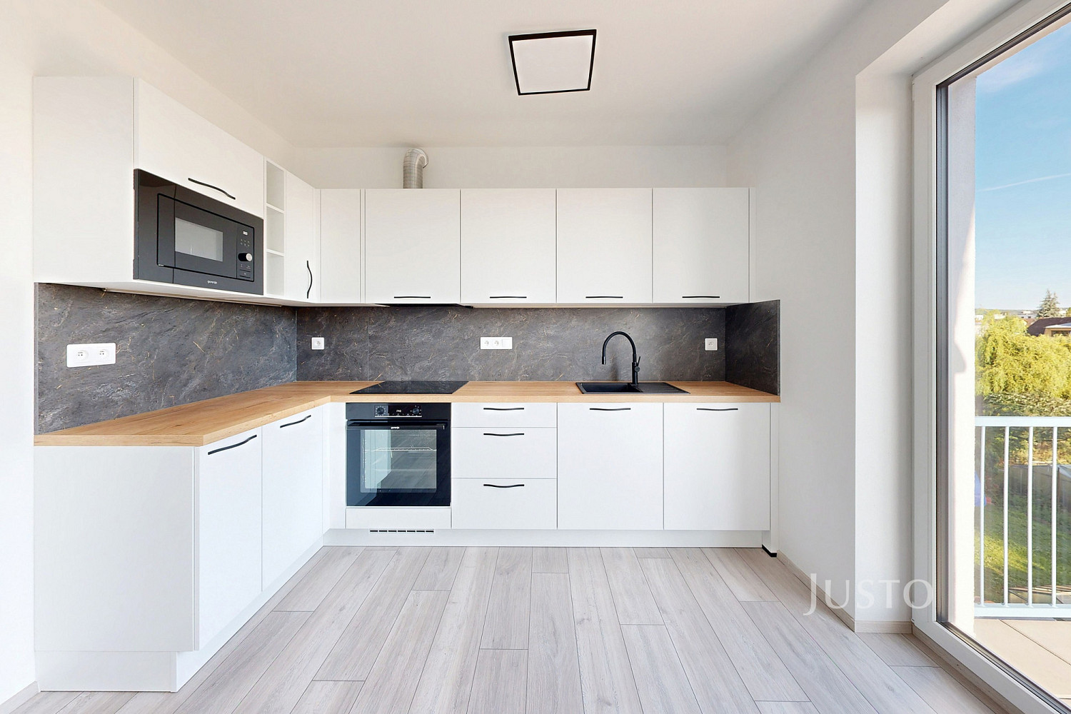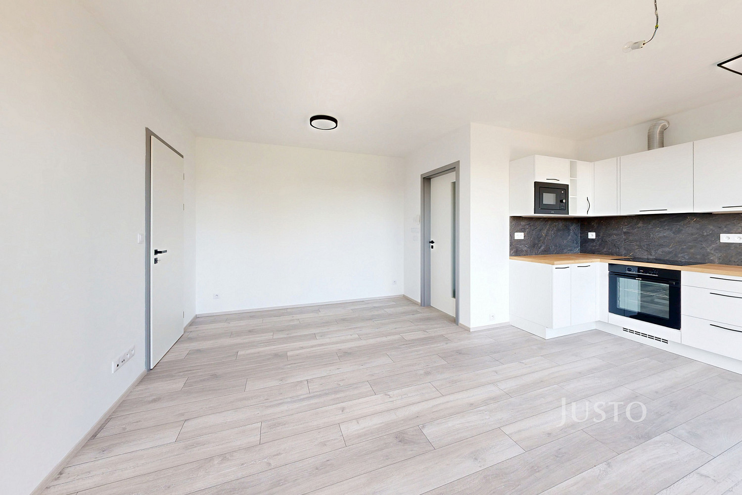 Dominantou bytu je světlý obývací pokoj s kuchyňským koutem o ploše 22,8 m² s přímým vstupem na balkon orientovanou na jih, odkud si můžete užívat příjemný výhled do zeleně. Kuchyňská linka je vybavena moderními spotřebiči – myčkou, elektrickou varnou deskou, troubou a mikrovlnnou troubou. Byt nabízí také samostatný pokoj (12,3 m²), vhodný jako ložnice nebo pracovna.