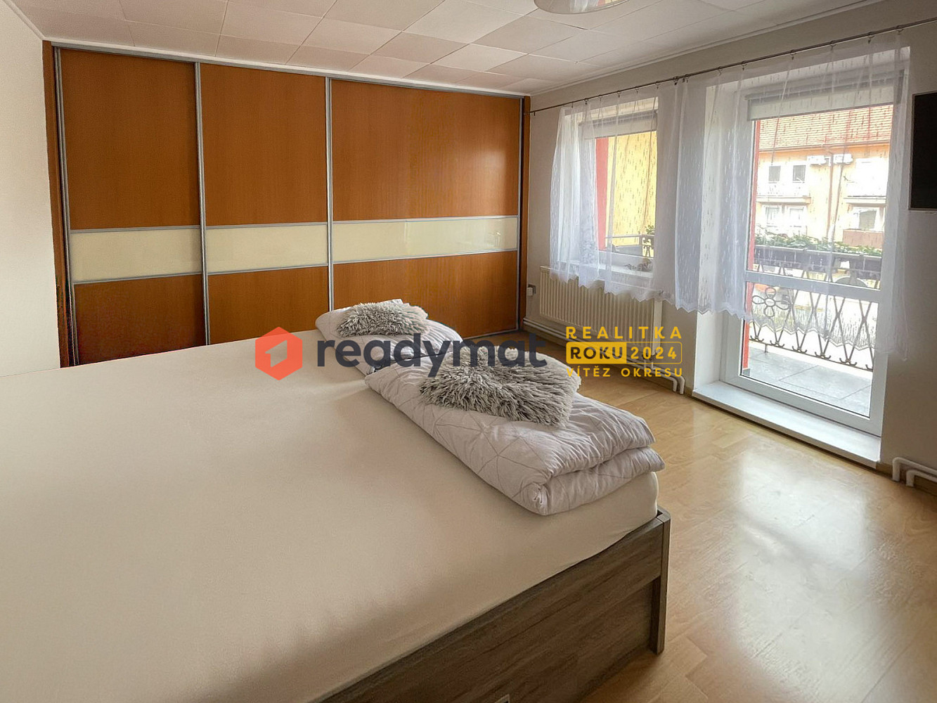 Ložnici s vestavěnou skříní a balkonem.