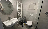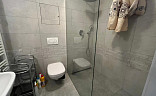 V koupelně se nachází prostorný sprchový kout se skleněnou zástěnou, umyvadlo a WC.