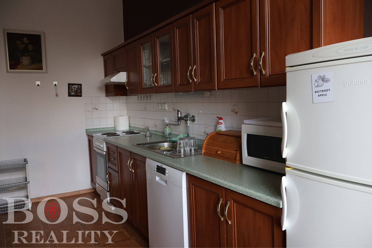 K dispozici je částečně zařízený. Plně vybavená kuchyň nabízí dostatek prostoru pro přípravu, vybavená spotřebiči (mikrovlnná trouba, elektrická trouba se sporákem, digestoř, myčka nádobí).