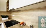 Kuchyně je vybavena vestavnou troubou, pračkou, ledničkou, myčkou, úložným skladovacím komínem a stolem.