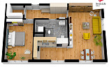 Dispozici tvoří obývací pokoj se stolováním o ploše cca 24 m, ložnice (14 m) a samostatná kuchyň (8,3 m) vybavená moderní kuchyňskou linkou. Koupelna nabízí sprchový kout, umyvadlo, WC, topný žebřík a přípojku na pračku. K bytu dále patří vstupní chodba s úložnými prostory a komora.