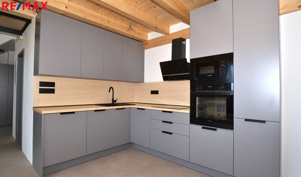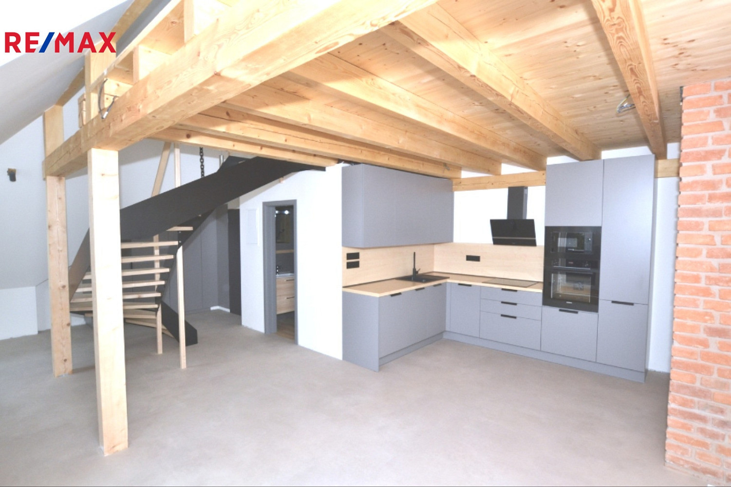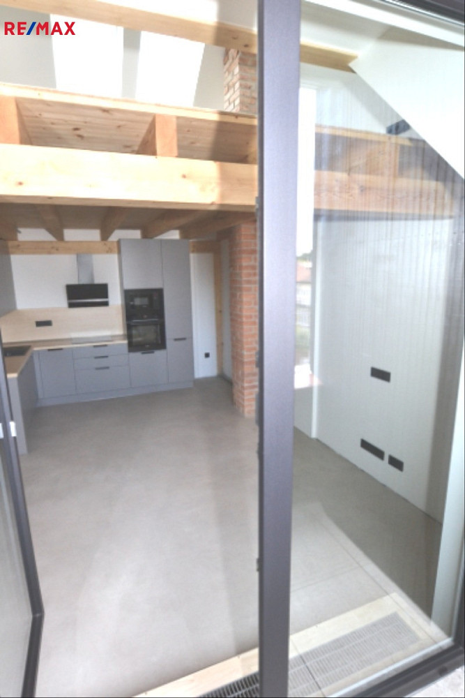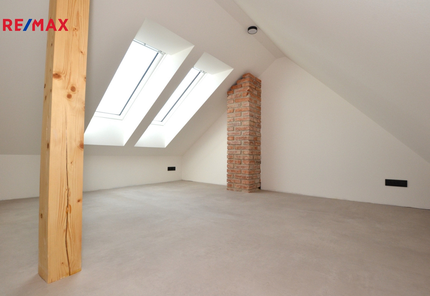 Byt čeká na svého prvního nájemce. Okna obývacího pokoje s lodžií jsou orientována na západní stranu, střešní okna ložnice jsou orientována na východní stranu do zahrady se vzrostlými stromy, kterou nájemce může využívat k relaxaci.