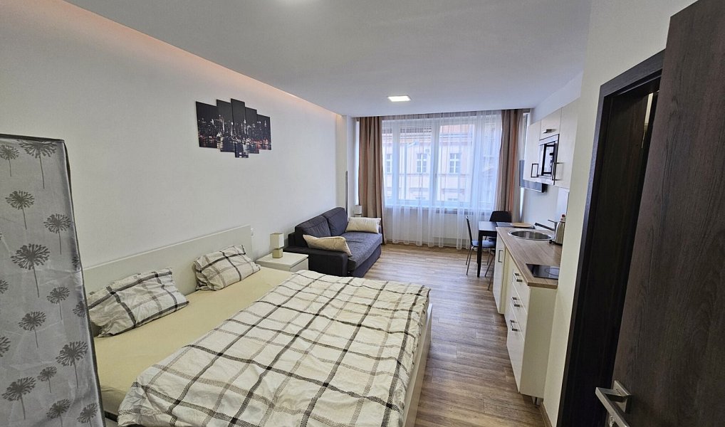Nabízíme pronájem zařízeného bytu 1+kk ve 2. patře cihlového domu na Praze 1, Nové Město, ulice Opletalova, kousek od metra A, C - Muzeum.