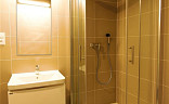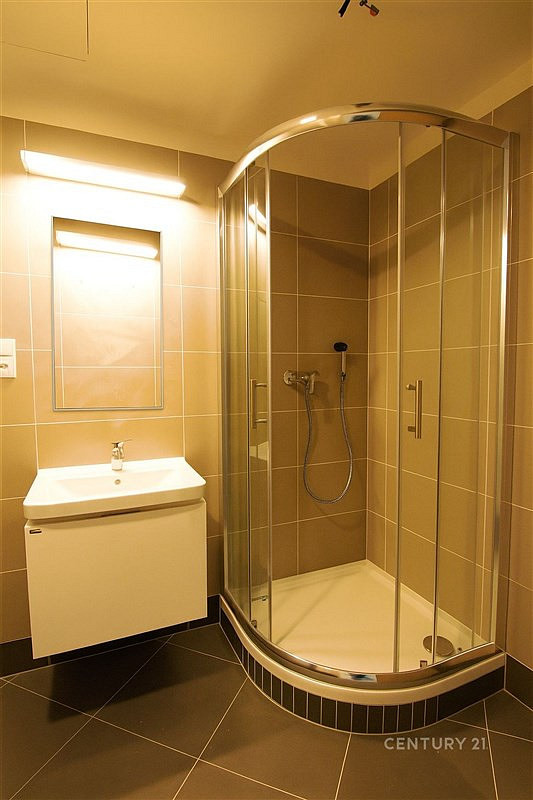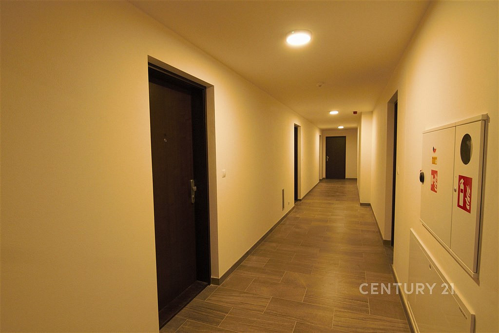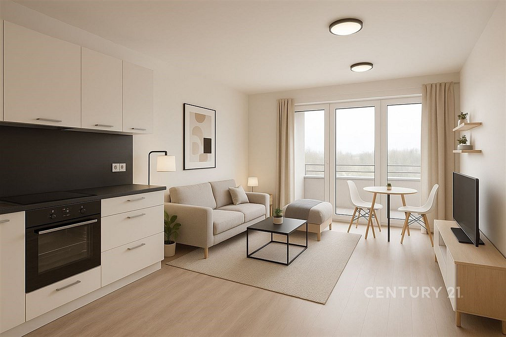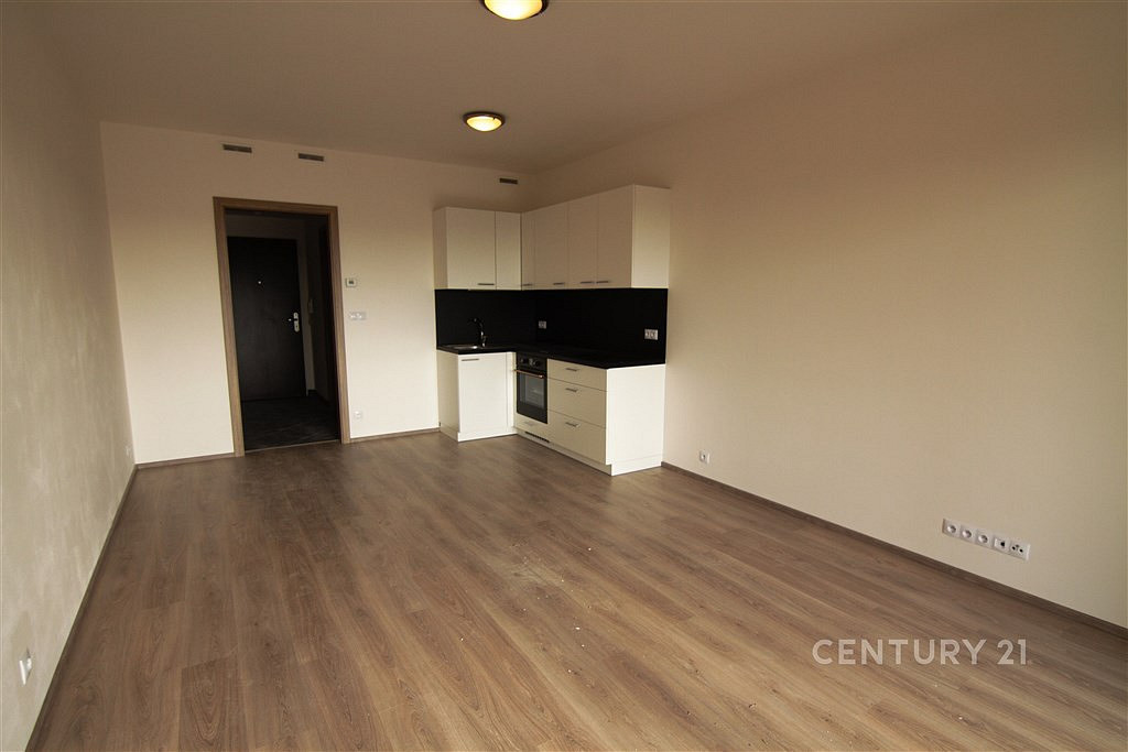 Vstupujete přes prostornou předsíň s možností velkých úložných prostor, z níž se vchází do hlavní obytné místnosti s celoproskleným vstupem na balkon. Orientace pokoje i balkonu je JV. Součástí obytné místnosti je kuchyňský kout, který je vybaven kuchyňskou linkou, sklokeramickou varnou deskou, elektrickou troubou a lednicí. Koupelna je vybavena sprchovým koutem, toaletou a prostorem pro pračku a sušičku. Pračka není součástí pronájmu. Podlaha je v obývací části plovoucí, v koupelně a na balkoně je dlažba.