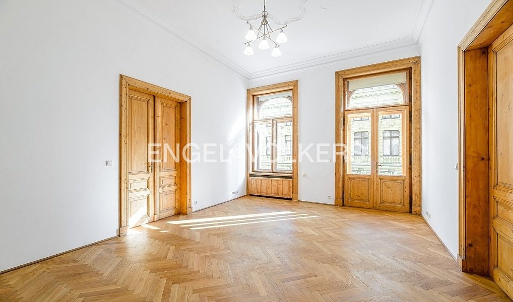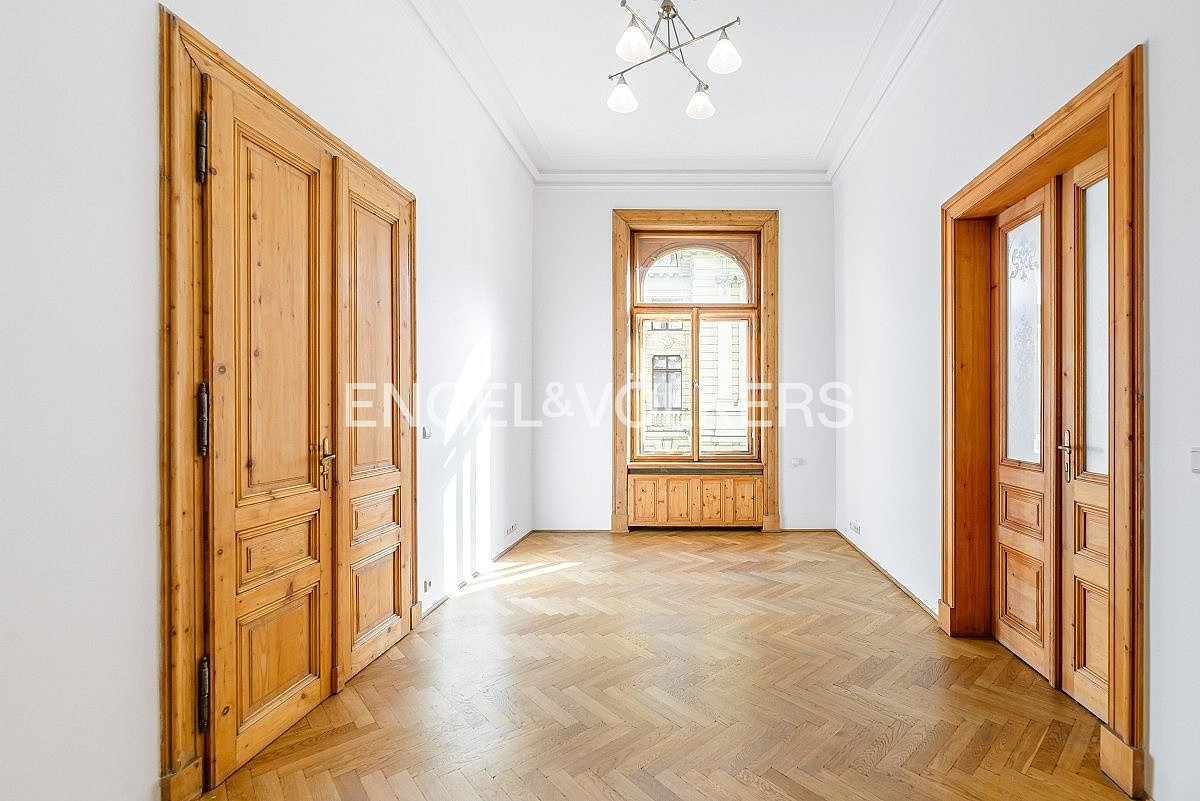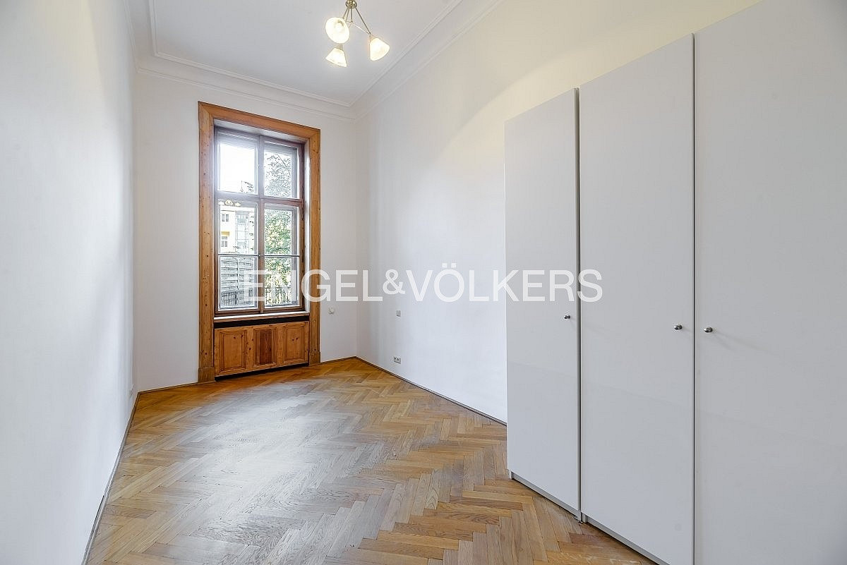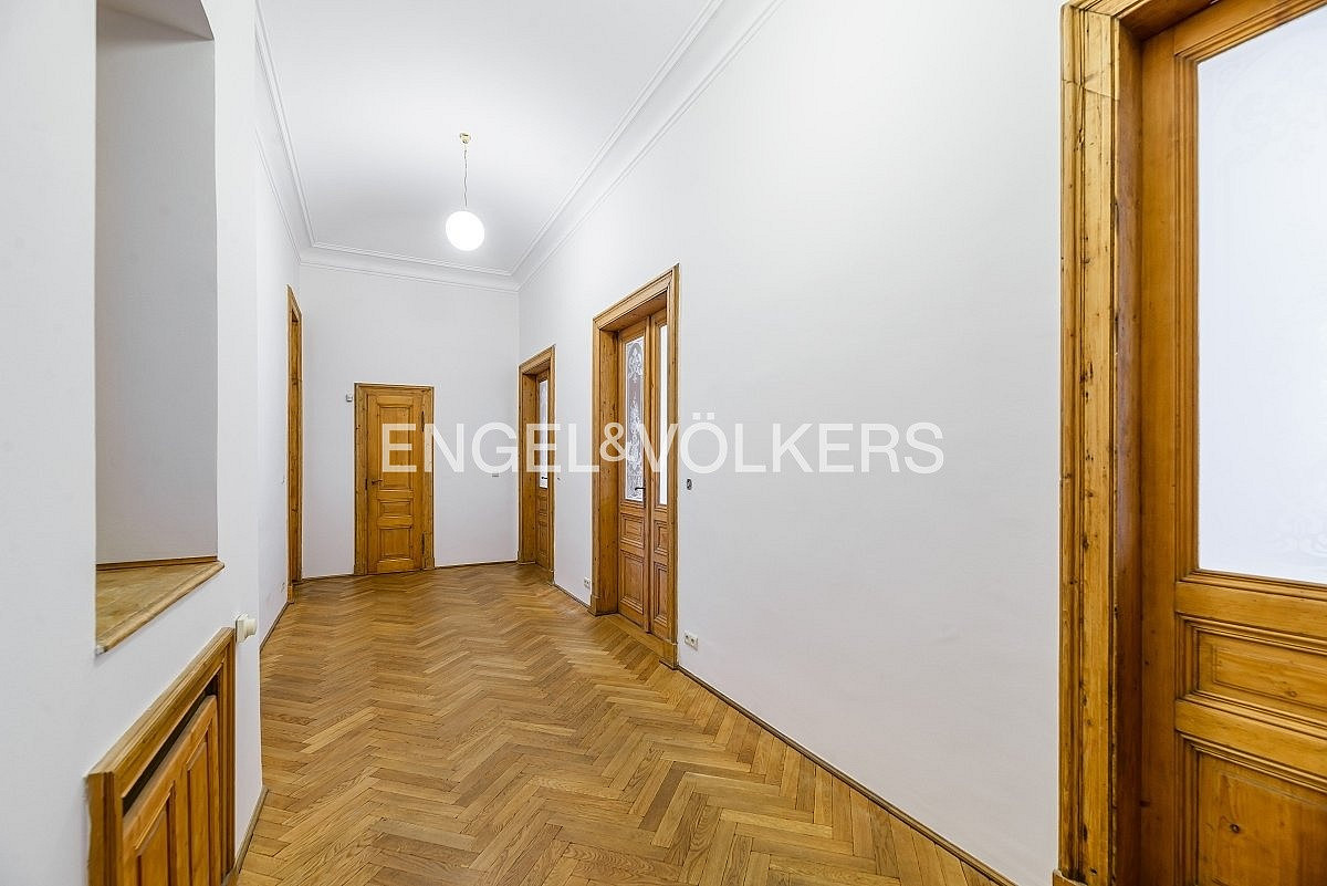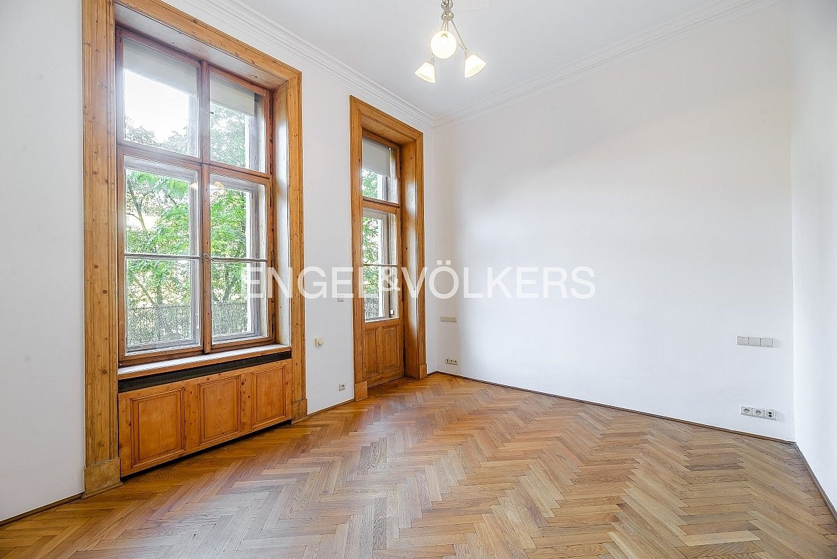 V bytě je světlý obývací pokoj, kuchyně, která je kompletně vybavena všemi spotřebiči značky Miele a čtyři další pokoje, které jsou prostorné a vzdušné s vysokými stropy zdobenými štuky.